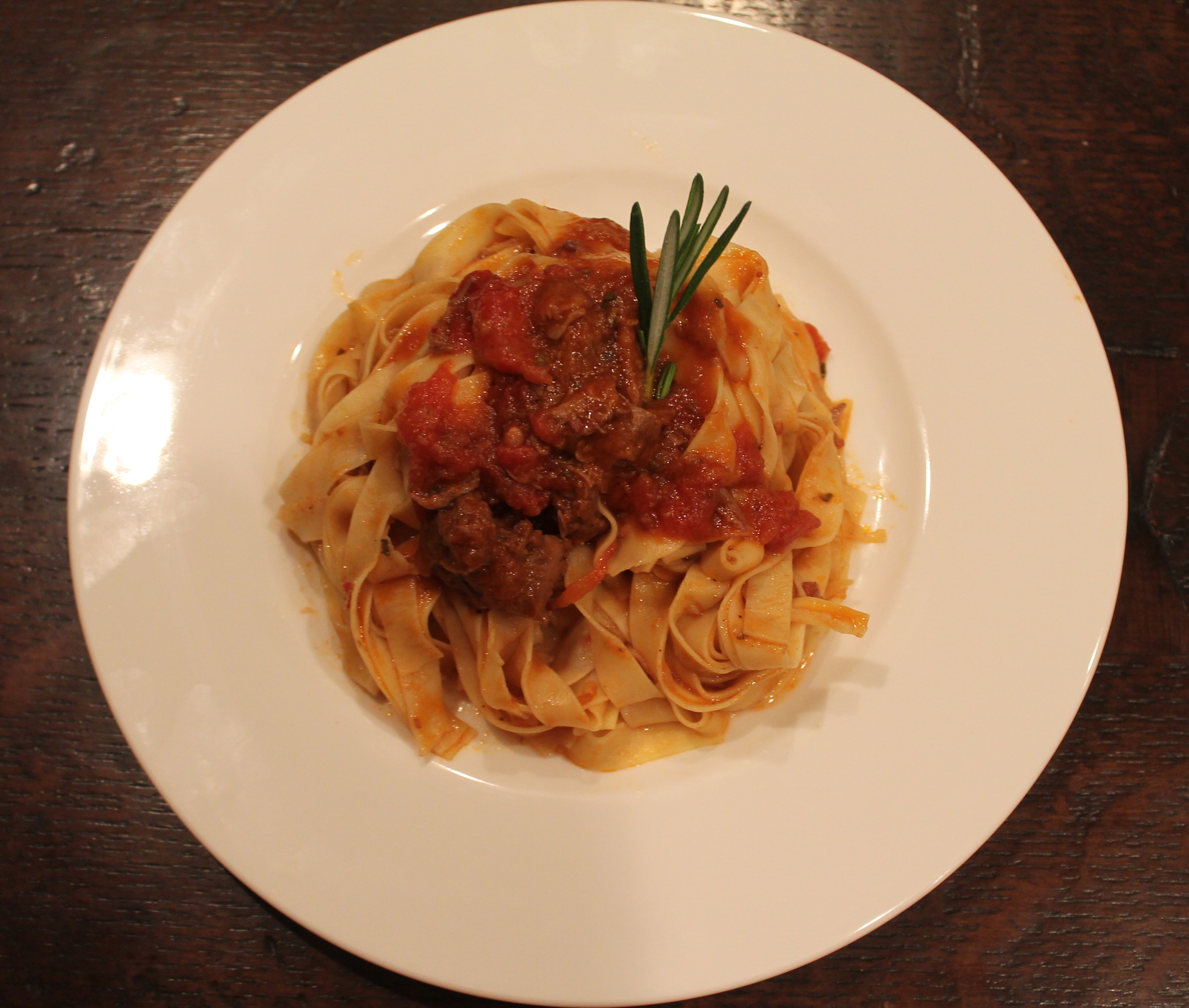 To go with my homemade pasta I really wanted to make a sauce. I figured that it would be a shame to dump store bought tomato sauce on my fresh pasta. In my opinion ragus, a tomato based sauce with meat, are the best type of pasta sauces. Bugialli, who is the king of Italian cookbooks, inspired the ragu I made. I used rosemary, onion and pancetta to build a foundation of flavor for my sauce then added in lamb, tomato and chicken broth. I also added a little red chili flakes to add a little punch. The lamb slowly cooks in the sauce creating a stew, slowly getting tender and releasing its flavor into the sauce. The end product is so tasty you could eat it alone as a soup.