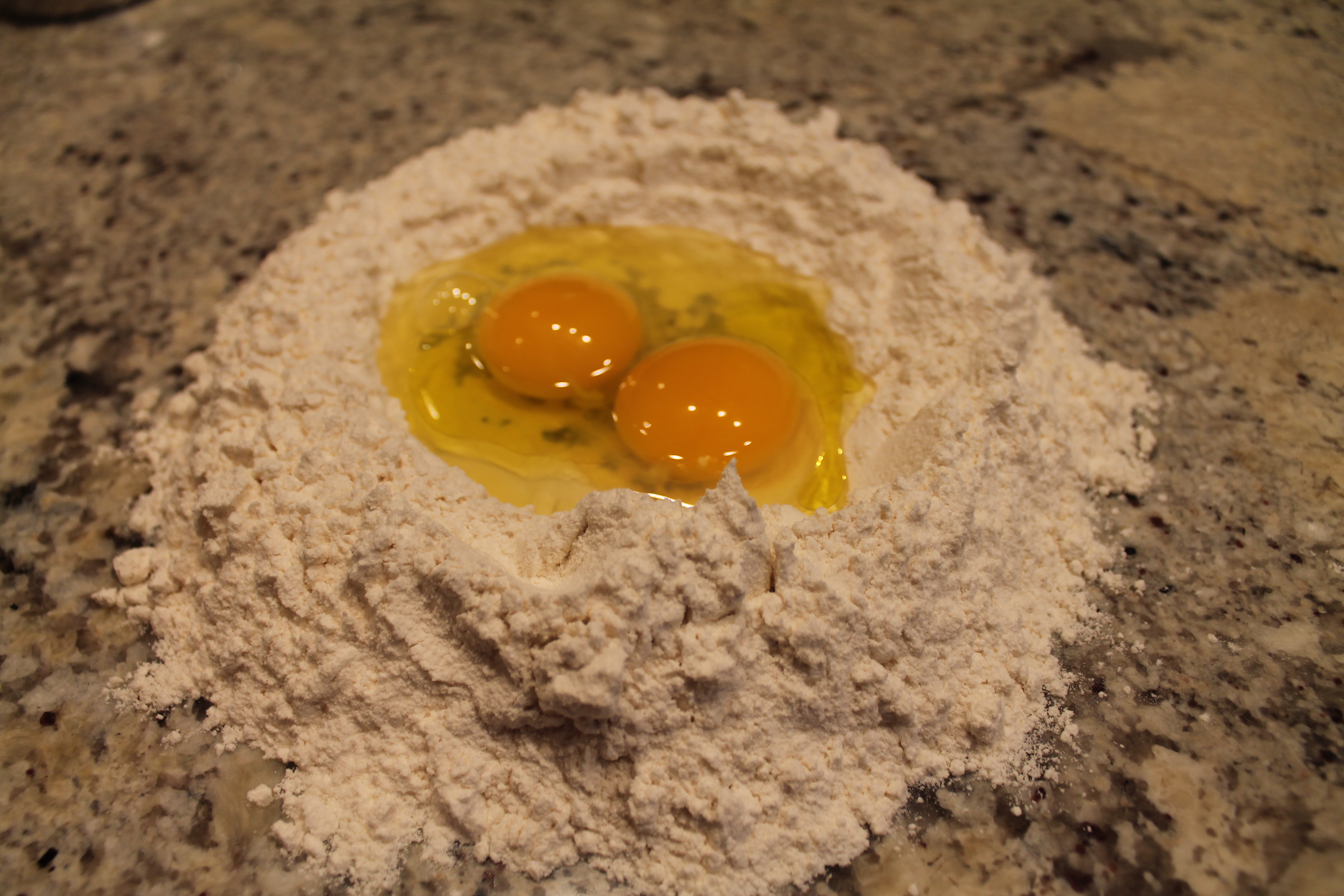7. On a large clean board place the flour in a mound and then make a large well in the center.
