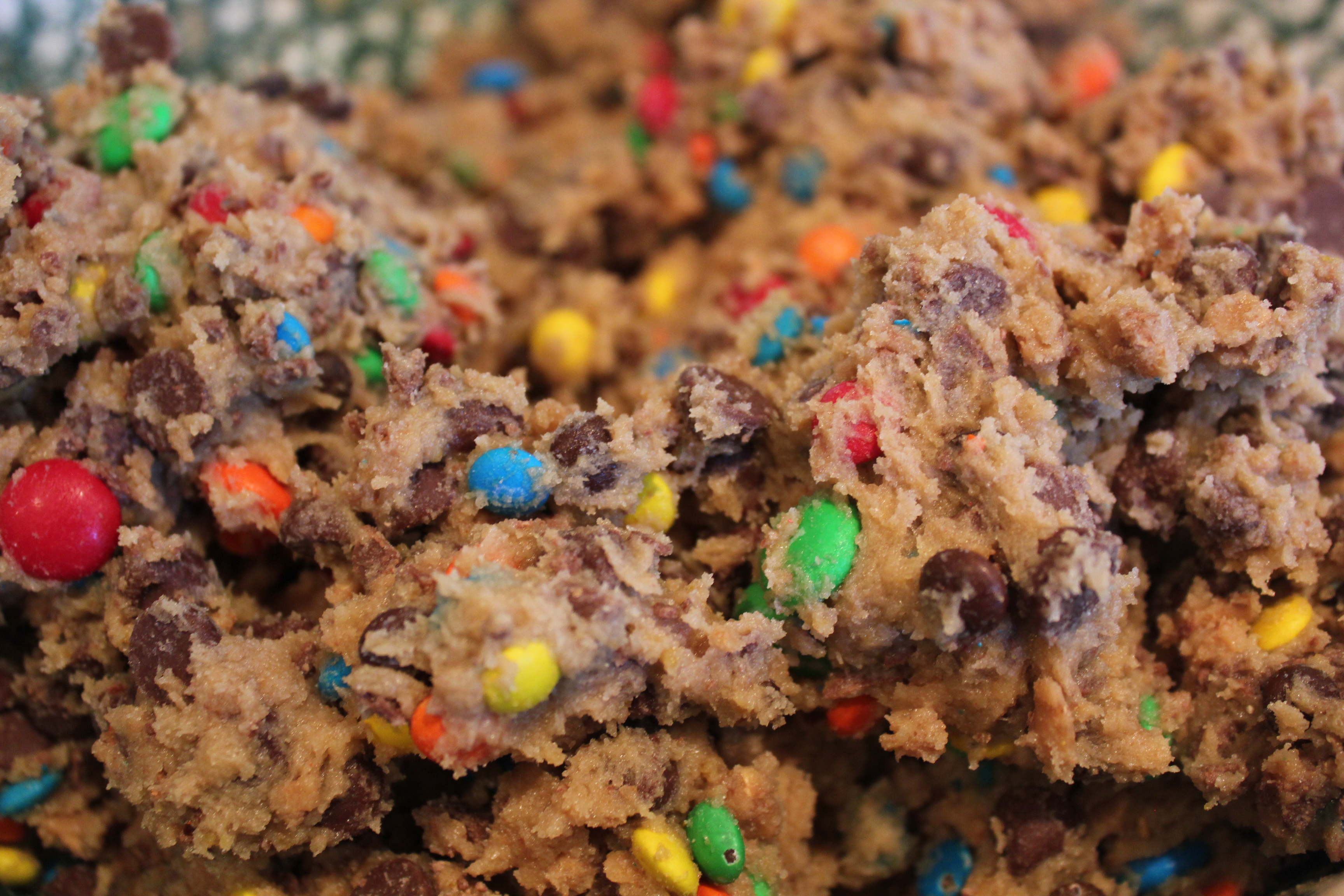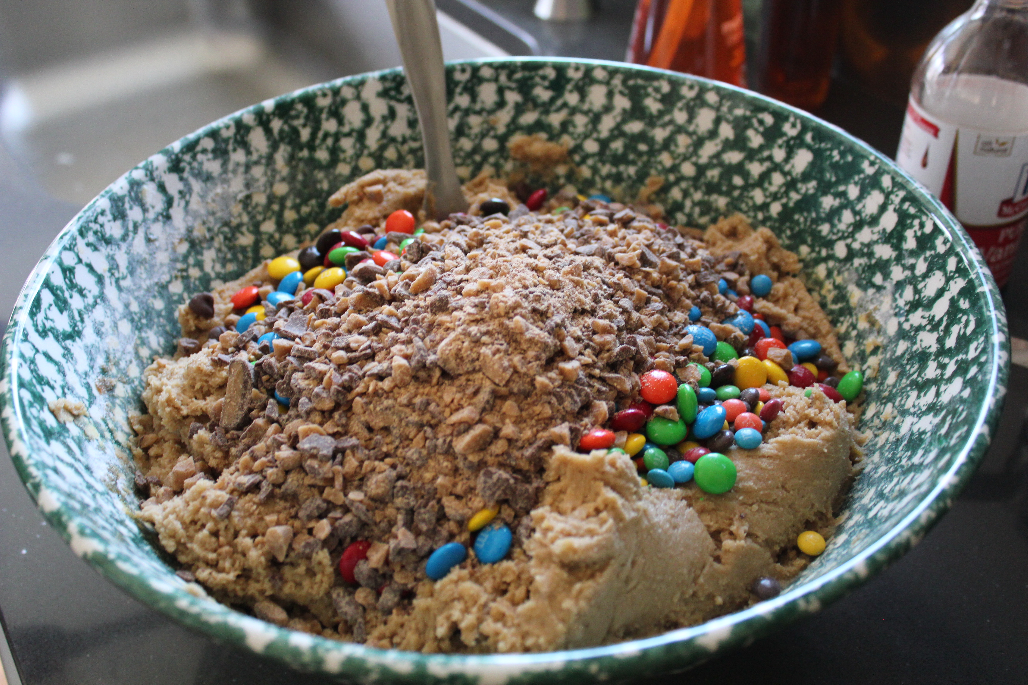 3. Add in toffee, m&m’s and chocolate chips and mix well.