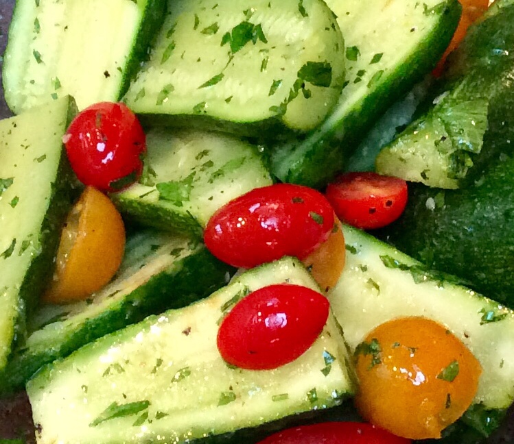 4. When the zucchini are done, drain them and cut them in pieces. Place them immediately in the oil. Toss to coat. They will absorb the oil and seasonings better while they are warm and their pores are open. Squeeze the lemon over the zucchini and toss again. Add the tomatoes when the zucchini are room temperature.