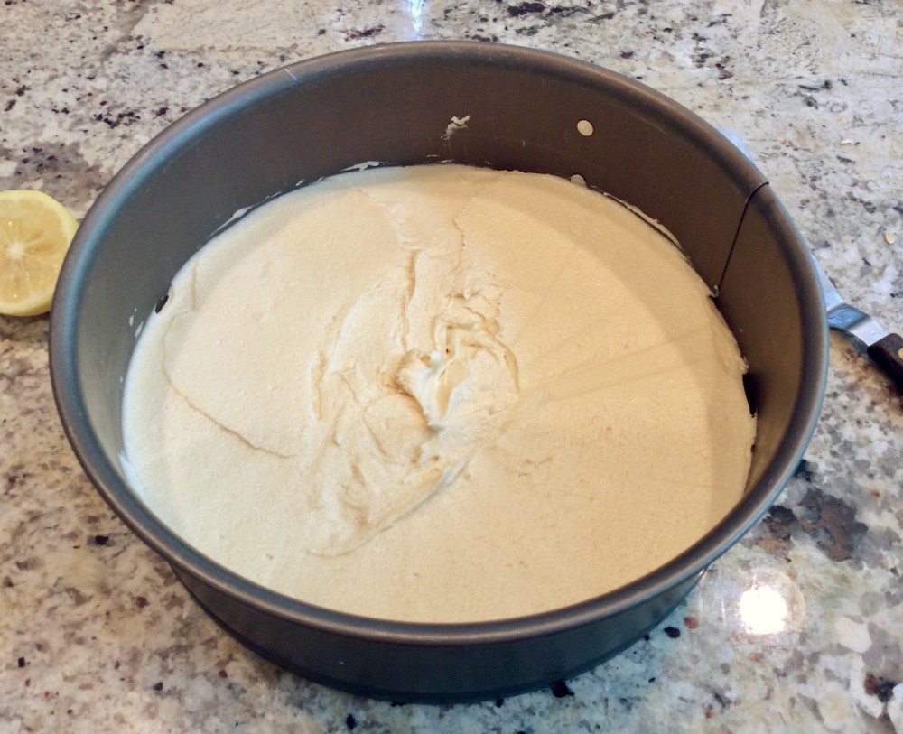 - Spoon batter into your greased springform pan, leveling the top with an off set spatula.