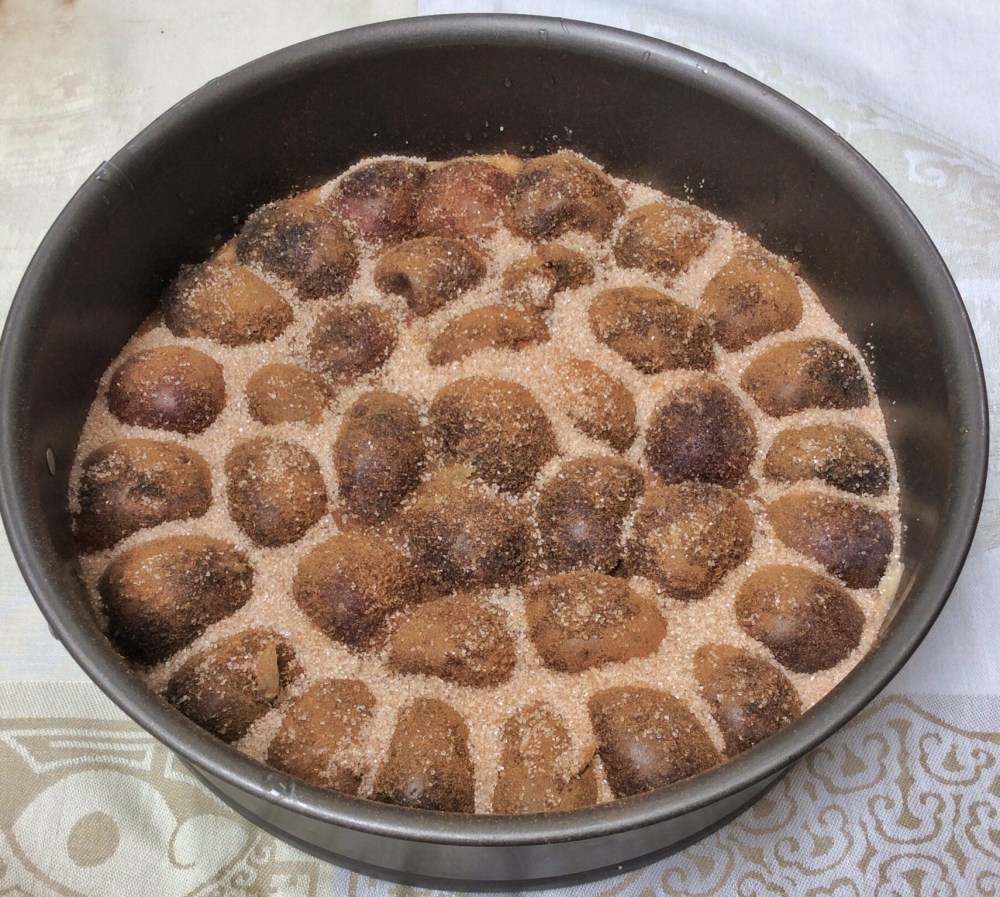 The NY Times recipe has a few versions, published at varying times. Depending on the publication, the cinnamon varies between 1 teaspoon of cinnamon and 1 tablespoon. The sugar varies between 1cup and 3/4 cup. I think 3/4 cup of sugar is plenty sweet and 1 teaspoon of cinnamon is likewise enough. The recipe doesn’t call for any flavoring in the cake, just cinnamon sugar on top. I love a combination of cinnamon, star anise and lemon zest and vanilla with plums and often make plum preserves with these flavors. So I added a bit of vanilla to the batter and added some star anise and lemon rind to the cinnamon and sugar that’s sprinkled on top. I also changed the granulated sugar to sanding sugar for the top as I like a bigger crunch.