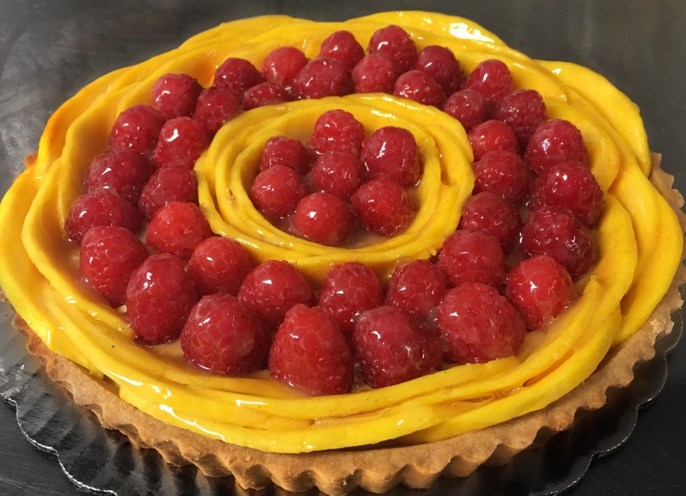 Yuzu-Curd-Tart-Mangos-Raspberriesfor the 9″ tart, I used one pint of Strawberries and about three Champagne mangos. Cut the mango off the center seed, lengthwise in two cheek. Then, peel off the skin with a very sharp paring knife. Next, cut each half lengthwise in very thin slices. The thinner the slices, the more flexible they will be and the more rose like. The rest you can infer from the picture.