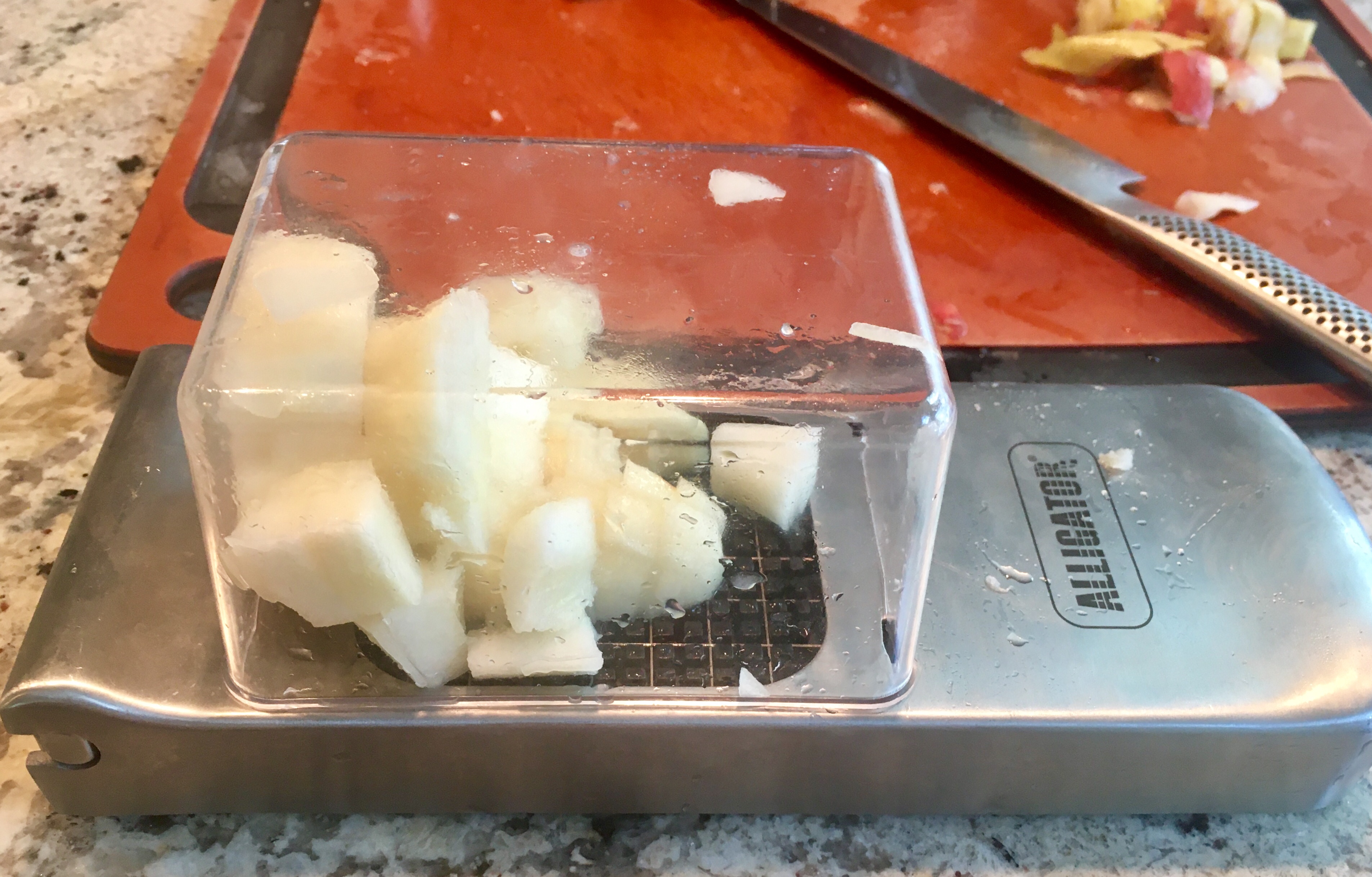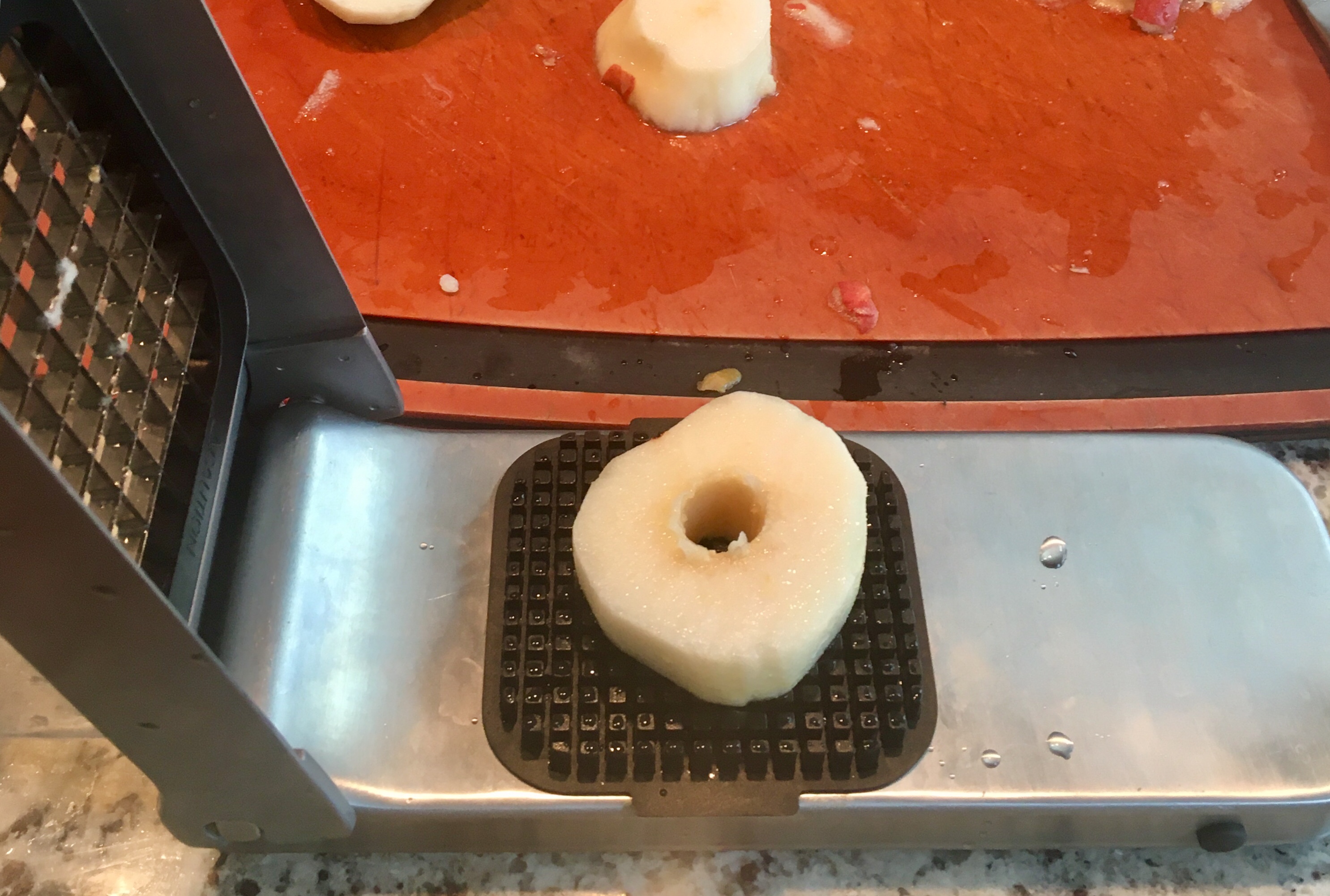 2. Puree 1/3 of the pears in a food mill and cut the other half into into 1″ chunks. I like to use a device called an Alligator. You can see it in the pictures below. I also use a small cookie cutter or a large piping tip to cut out the core.