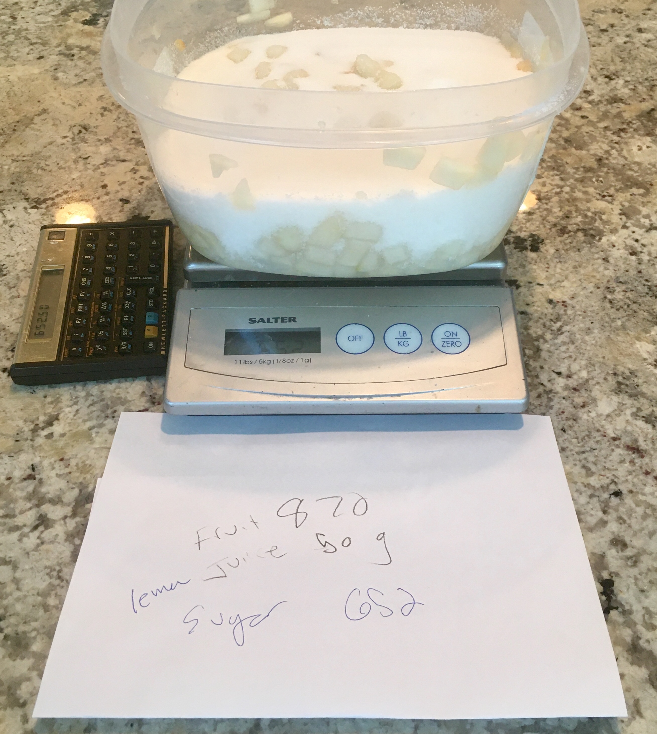 4. Drain pears and weigh. If you have 1000 grams you don’t need to adjust anything. If you have less than 1000g you can either add more pears or lower the amount of sugar and lemon juice. Multiply the weight of the pears by .75. That number represents the amount of sugar you need to use. Take that same pear weight and multiply by .06 and that will give you the amount of lemon juice you will need. In this instance, The net weight of my pears was 870 grams so I reduced the lemon juice and sugar. It’s the risk you run when your preserving fruit in a house with kids. Somehow, pieces are always going missing. .
