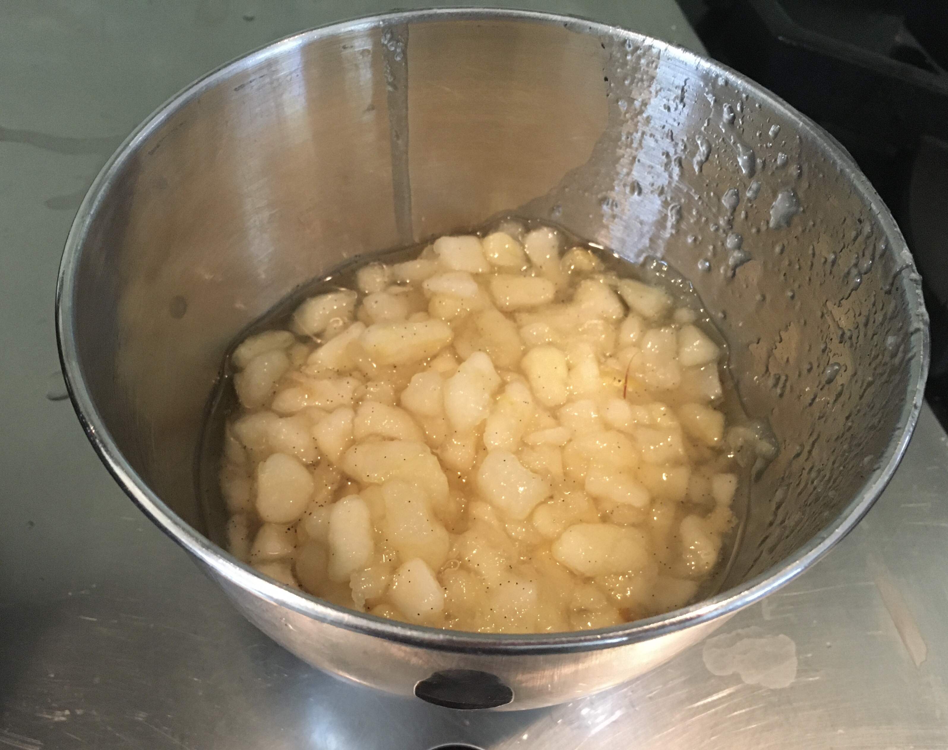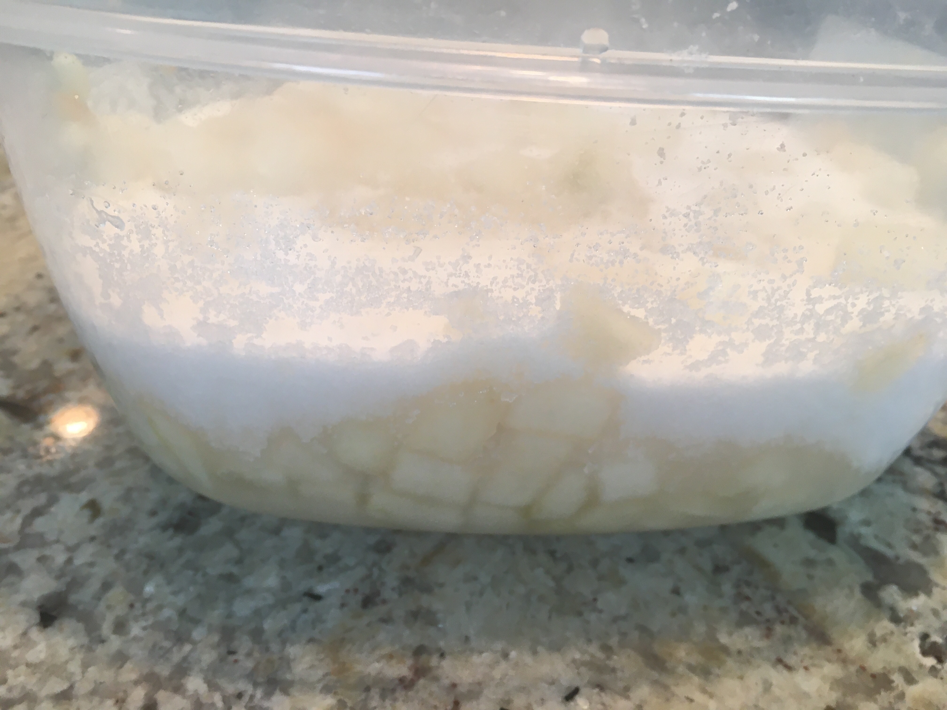 3. Toss pears in a solution of 2 tablespoons of honey dissolved in 1cup of cold water. This helps to prevent browning. You’d think that the lemon juice would keep the pears from browning but I’ve still had pieces turn brown on me. Dipping them in the honey/water solution is extra insurance.