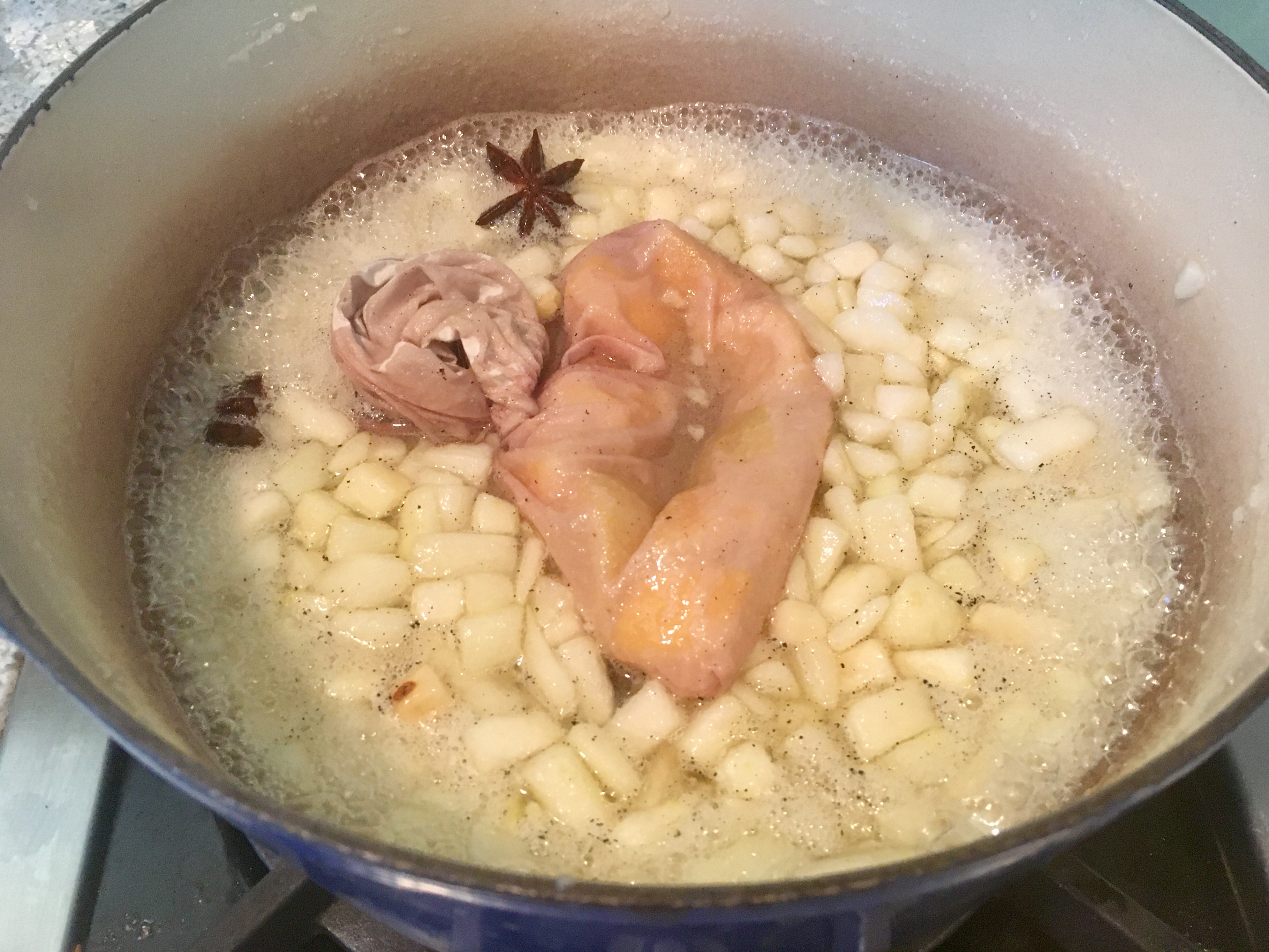 6. Add pectin bag, star anise and vanilla to pears. Put the mixture in your clean preserving pan. and put the pan over a low flame and stirring occasionally until all the sugar has dissolved. Once the sugar has dissolved, put the flame on high and bring to a simmer.
