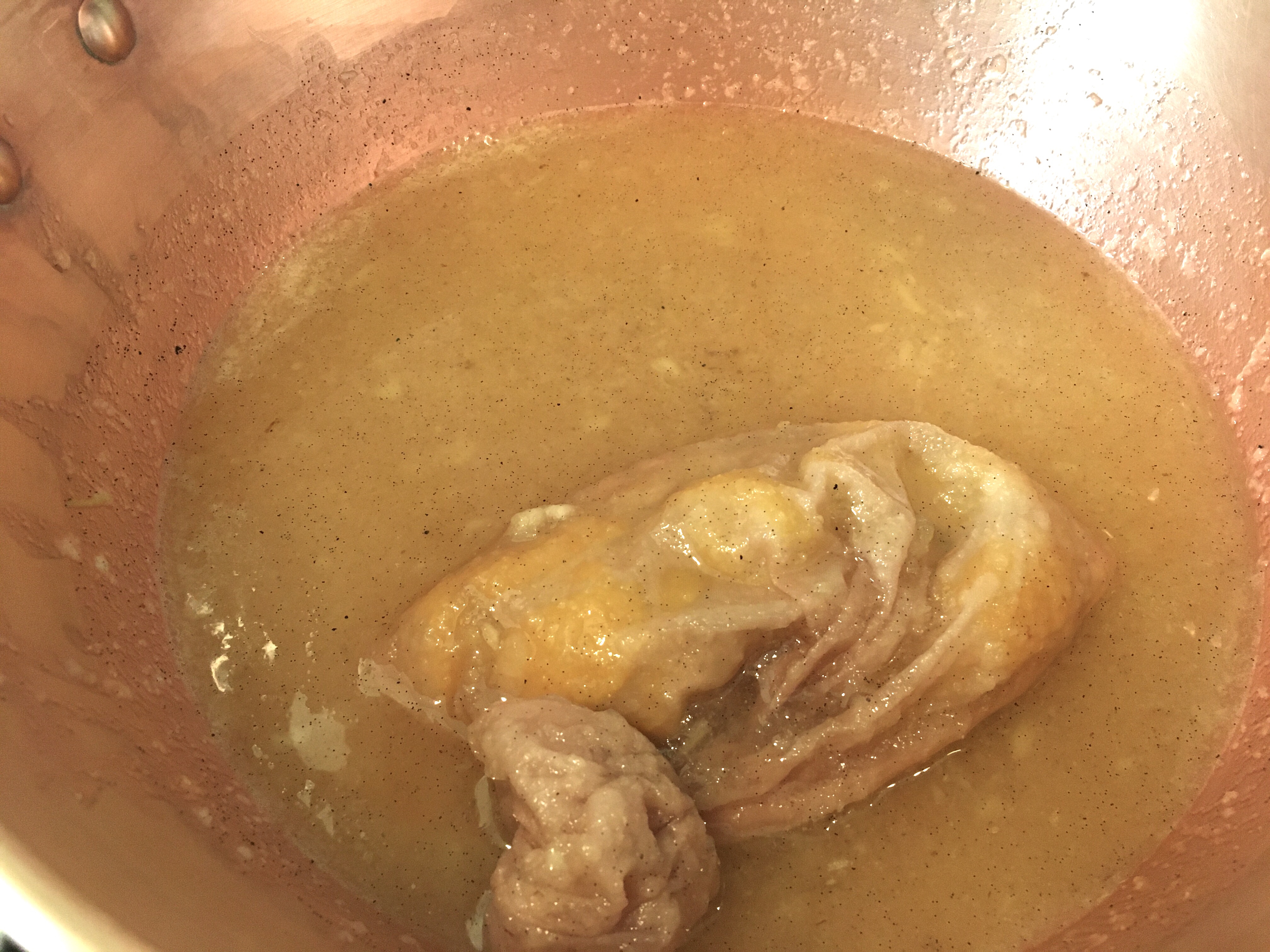 1. Pour the preserves into the preserving pan with the pectin bag. Fish out the chunks of pear with a slotted spoon and set aside in a small bowl. You will add them after the juice gels. This keeps the integrity of those chunks. I don’t do this with every fruit but pears are pretty delicate.