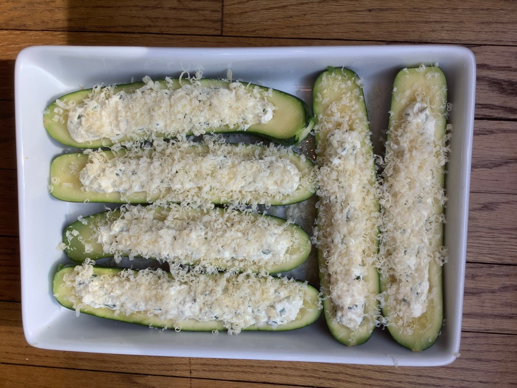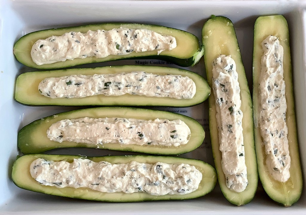- Blot the zucchini dry with paper towels and fill them with the cheese. You can mound it up a bit, it will stay in place.
