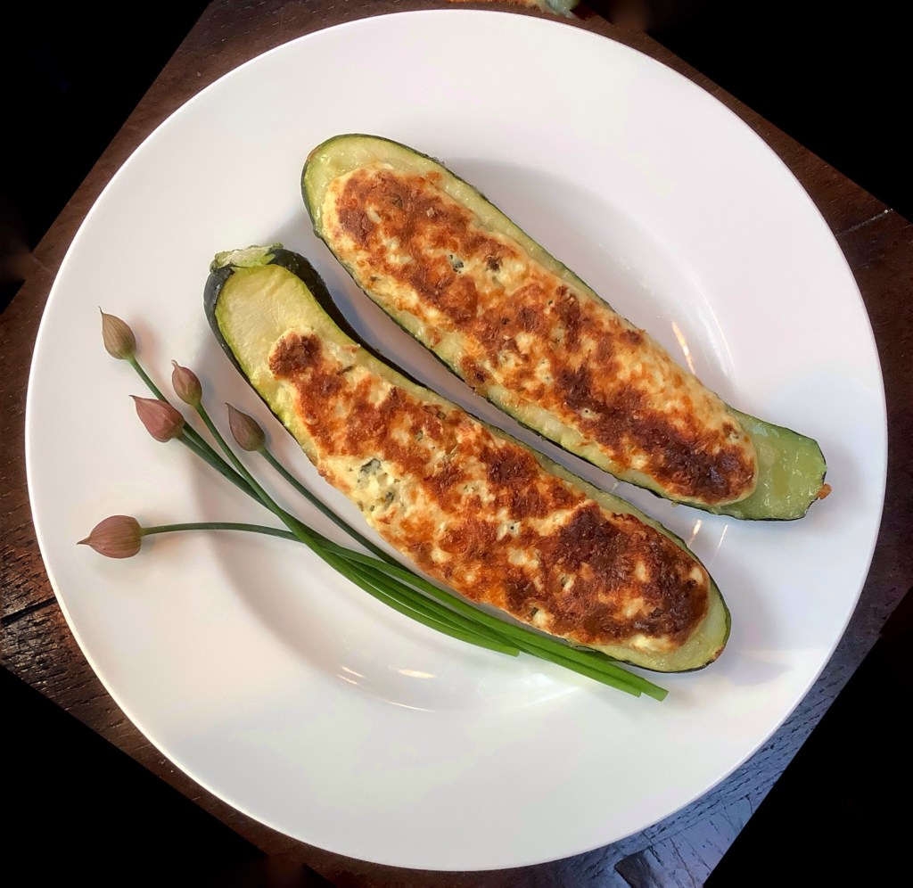 - Fill the zucchini with cheese. Grate the gruyère over the zucchini and place on your highest rack in the oven. bake about 30 minutes until,the zucchini is al dente. If cheese hasn’t browned, run it under the broiler.