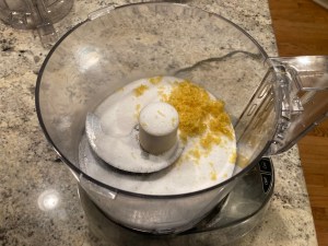 3. Place sugar and lemon zest in food processor and process about a minute to release lemon oil into the sugar. If you don’t have a food processor you can just rub the zest in the lemon peel. You can also do this in a stand mixer.