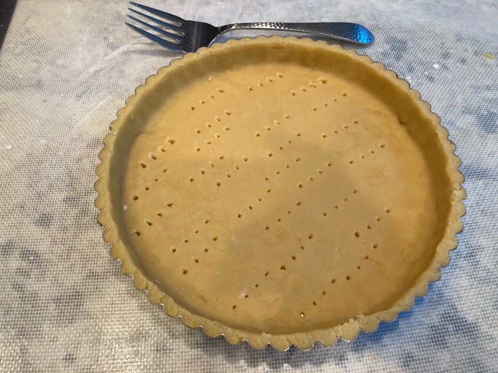 11. Lightly grease the sides of your tart shell. It will help the dough stick to the sides. Remove the plastic wrap and fit the dough in to the tart shell making sure not to stretch the sides. Cut off any excess with a sharp knife. With a fork, generously dock the bottom of the shell. This will help keep it from puffing up in the oven.