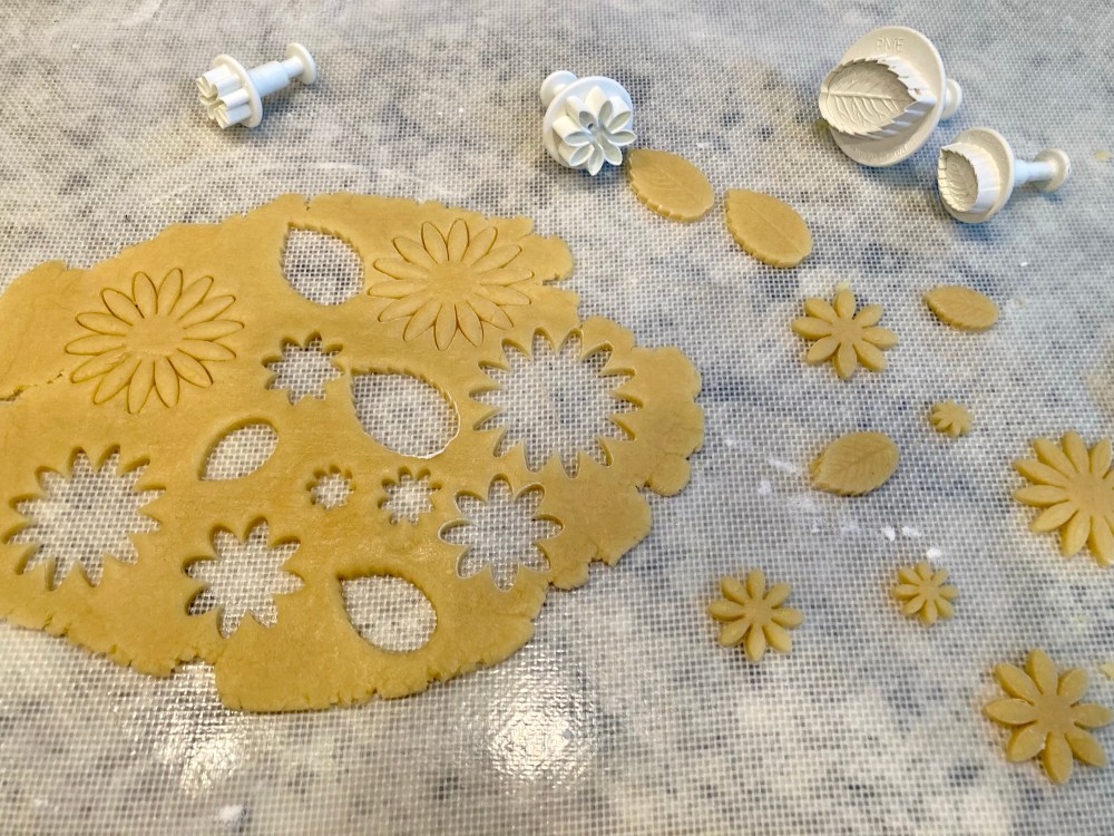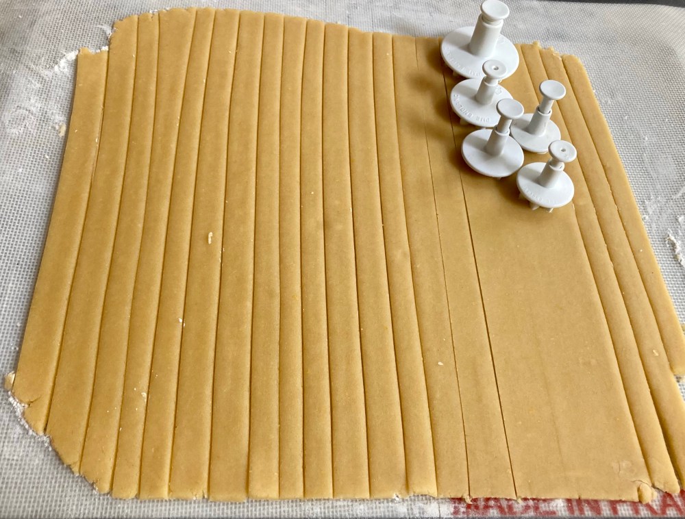 14. Take a ruler and sharp knife and cut eight 1″ strips of dough and some leaves and flowers. For the picture below I used my dodgy 4 wheel pastry cutter and it made irregular strips. Next time I’ll use a ruler and a sharp k ice to mark and cut the strips. For the leaves and flowers, you just dip them in flour, press it firmly on to the dough and lift it up. Sometimes the cut piece drops out and sometimes it needs a little nudge, and sometimes you have to pop them them in freezer so they release .