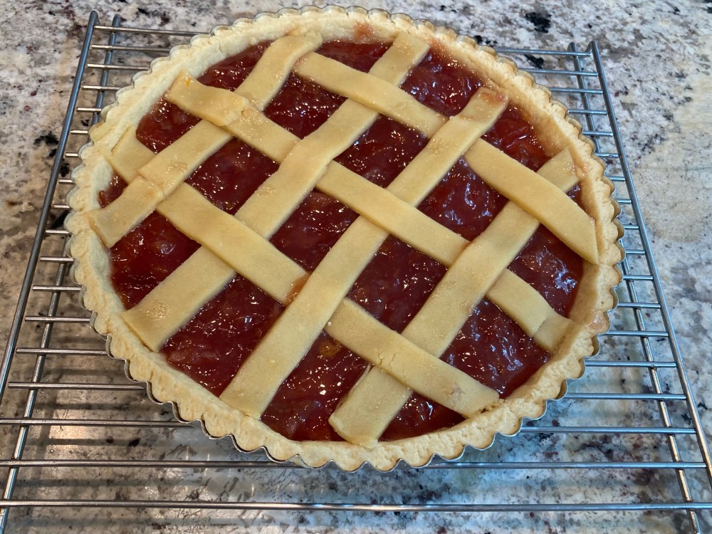 One of the excursions we made in Sicily was near Siracusa, a really beautiful town on the water. We were invited to lunch at the farm of a Contessa. She was a lovely down to earth woman and a great cook. As a pastry chef, the dish that caught my fancy was a crostata. A crostata is made with a sweet dough enriched with eggs, sugar and butter called a pasta frolla. It’s usually filled with homemade preserves. It’s every housewives go to dessert and you also see it in many pastry shops. When the Contessa made it for us she filled it with homemade orange marmalade from local oranges. It was so simple but delicious. It’s one of those simple pastries that is heavily dependent on excellent cultured butter and great preserves.