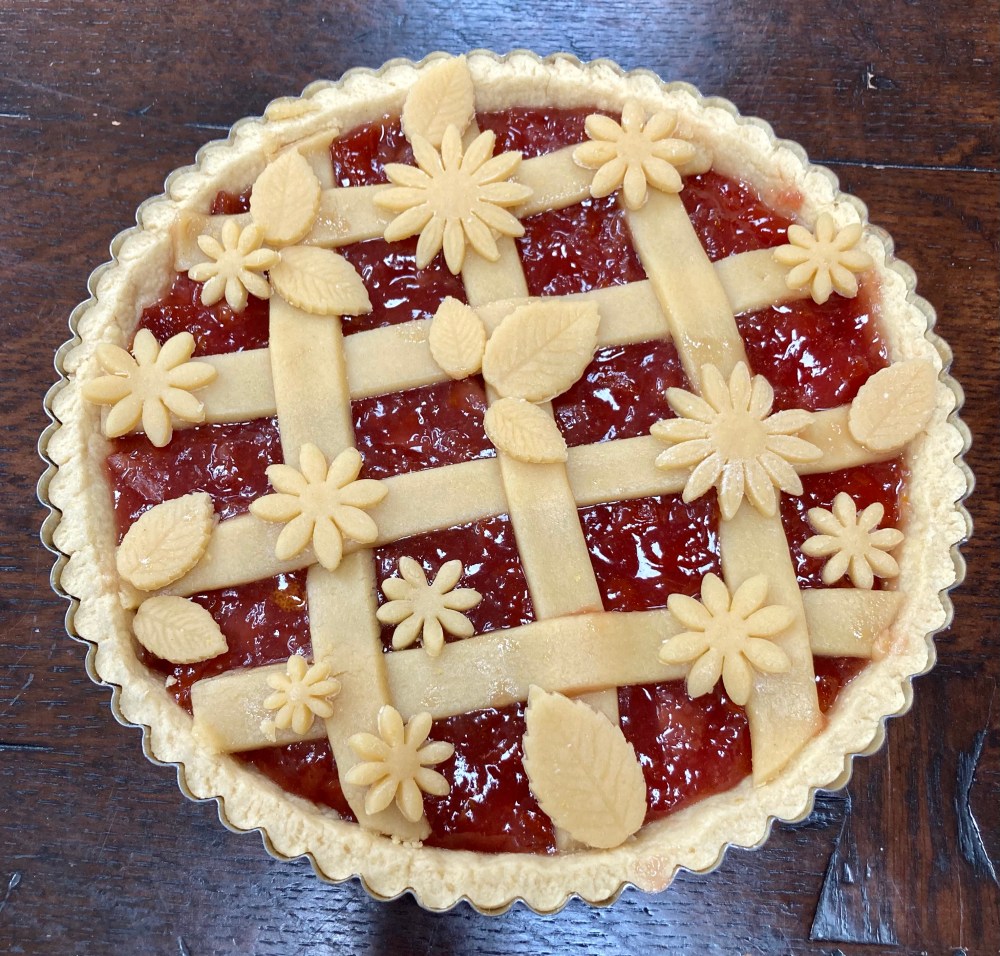 17. Pour marmalade into crust. It should come to 1/2″ below the rim of the crust. Weave lattice on top of the crust: put four strips across the top and then one by one weave the remaining strips. Don’t worry if you have some broken bits of lattice. You can cover them with leaves and flowers. Remove leaves and flowers from freezer and arrange on top of the tart.