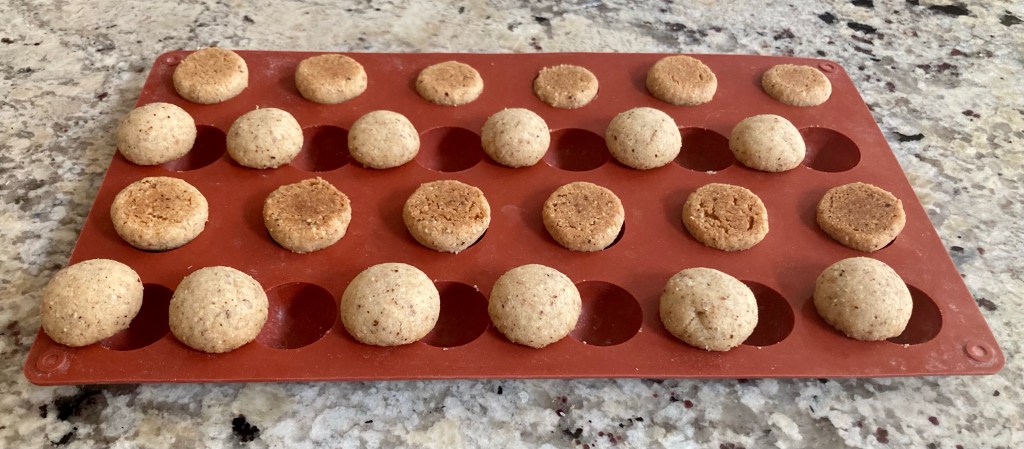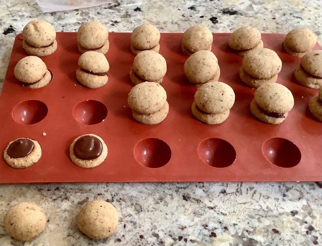 - Pair off the cookies. I like to build the sandwiches which in little silicone demi sphere molds. It stops the cookies from rolling around while the chocolate sets up.