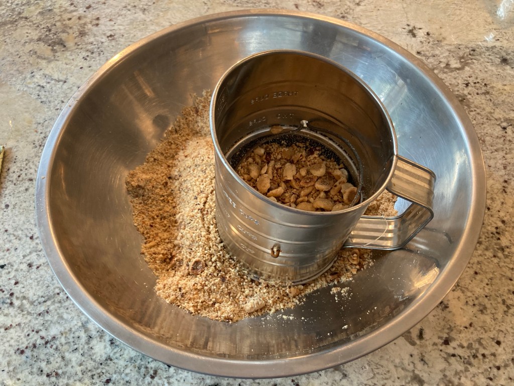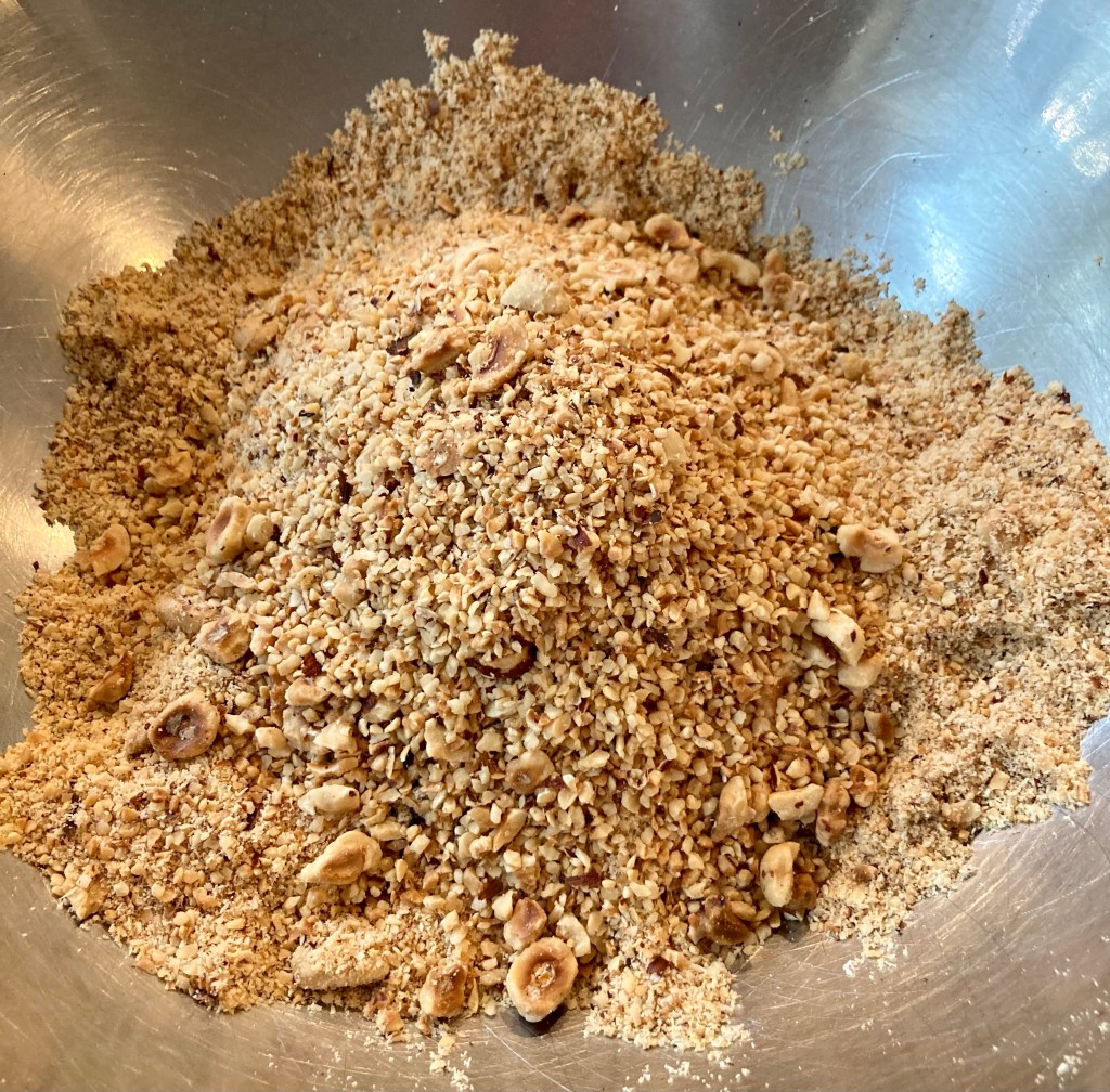 - When the hazelnuts are cool, place the fine grating disc in your food processor and grate the nuts. Put all the grated nuts into a bowl. Using a hand sifter to sift out out any big pieces into a second bowl. Take the contents of the second bowl and run them through the grating disc again. Then, put your chopping blade in the food processor and chop them until they’re about the same size but don’t chop them until they’re oily. You’ll chop them time with the sugar and flour.