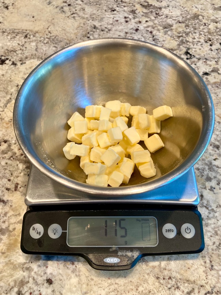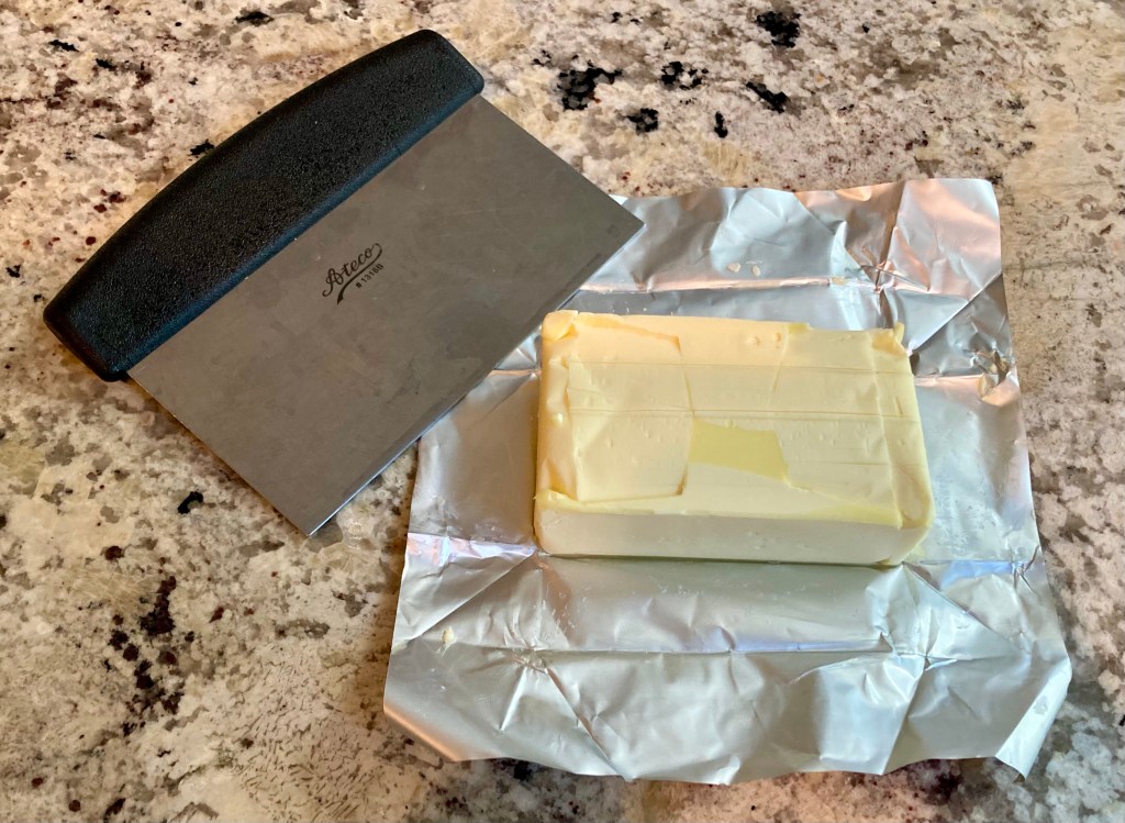 - Take your butter from the refrigerator and cut into 1/2” cubes, then place back in the refrigerator. I like to use a bench scraper, not a knife. It’s safer and gives you straighter cuts because the bottom is not tapered.