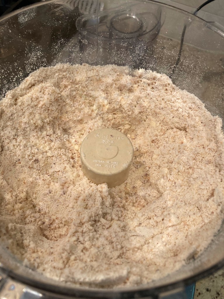 - Place the sugar, flour and grated hazelnuts into the food processor with the slicing blade attachment. Pulse on and off until everything is well combined. Be careful not to over process as you don’t want the nuts to release oil and make everything greasy.