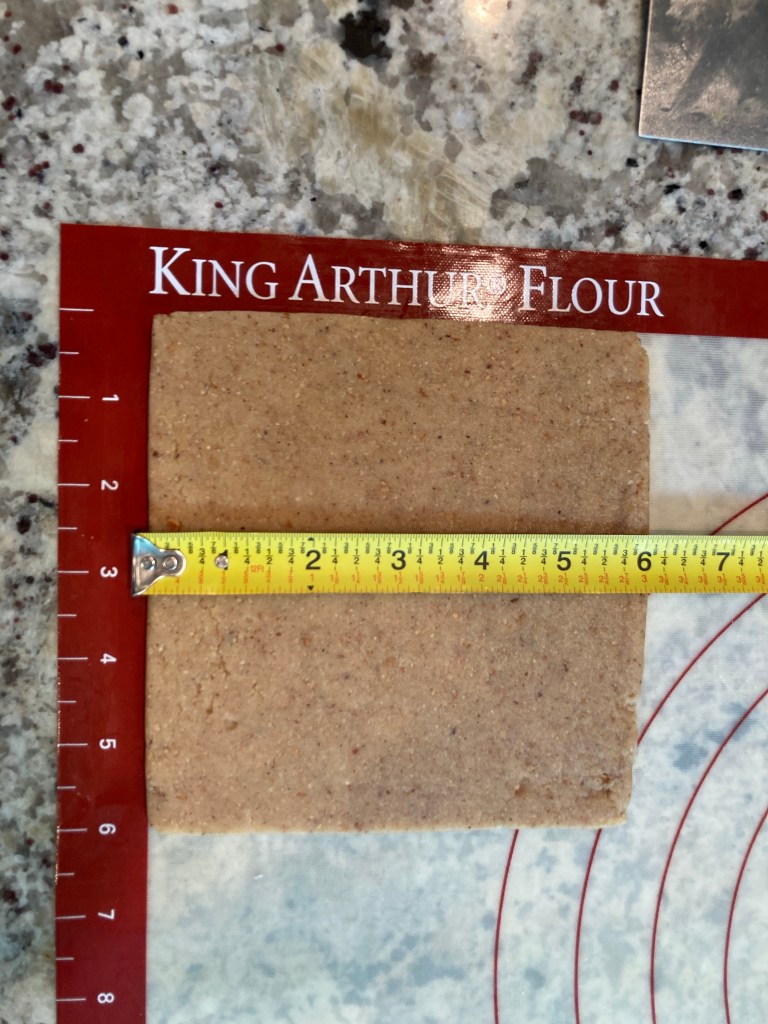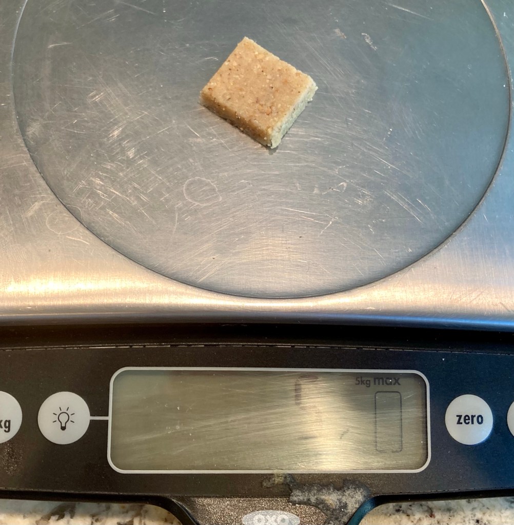 - Choice #2: divide dough into two portions. One portion should be 320 grams and should be shaped into an 8” square. This portion should be cut into 64 equal pieces. The remaining piece should be shaped into a 6” square and cut into 36 pieces. Both the 8” square and the 6” square should be chilled before they are cut. Each square should weigh 5 grams and should be rolled into a ball between the palms of your hands. Be gentle because the dough has a tendency to crumble. If it does, just pinch it together and keep on rolling. The heat of your hands will help make the dough malleable. Once I’m done rolling a ball, I drop it on the counter top. This flattens the bottom so they don’t roll all over when you put the tray in the oven. Now, they will,have a slightly higher mound if you don’t flatten the bottom but, it drives me crazy to na e them rolling all over the cookie sheet. Depending on how straight you can cut, each square will be 5 grams. I can’t seem to cut a straight line so I usually have to make some adjustments. I put every piece on the scale and if it’s even a gram too light I’ll take a piece from another square to make it 5 grams.