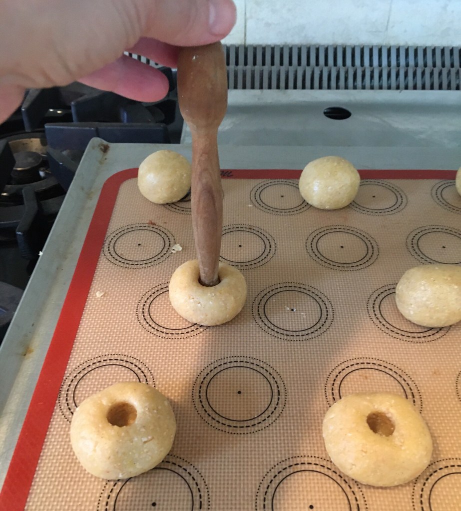 The origins of this cookie started with a recipe I fell in love with from Carol Walter’s Great Cookies book. It’s her Cornmeal/Cardamon Biscotti recipe which in turn was given to her by Sam DeMarco. So it goes with recipes. It is one of the best biscotti recipes I’ve tasted although I did significantly cut the cardamon so it is a whisper not a roar. Around the time that I made the biscotti I tasted a thumbprint cookie that someone had filled with orange marmalade. I thought the cornmeal/cardamom biscotti dough might make a nice little vehicle to house the orange marmalade.