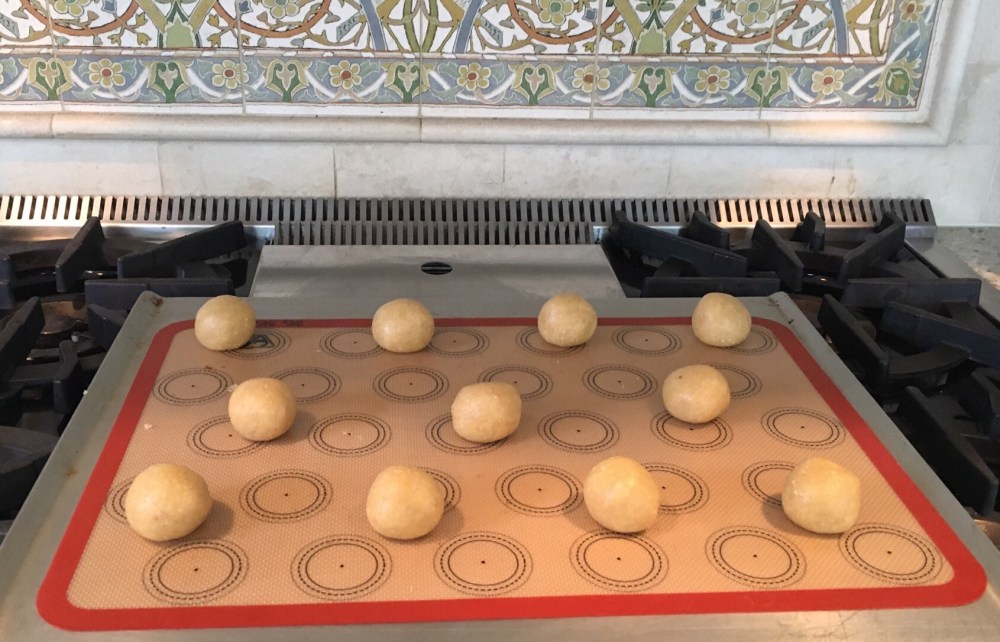 - Scoop a tablespoon of dough and roll it into a ball. Place on a cookie sheet lined with parchment or a silpat. Repeat with the rest of the dough. Space cookies about 1″ apart.
