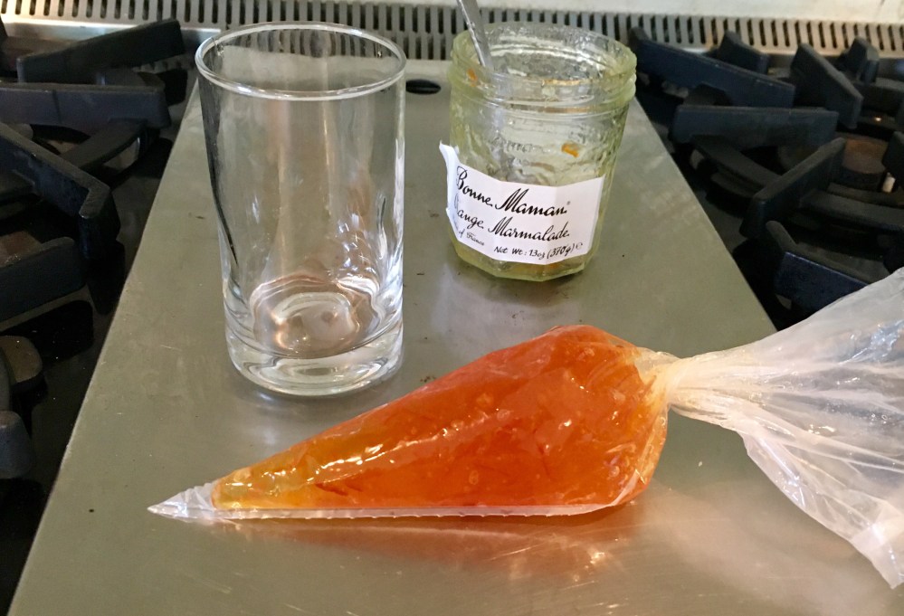 - Spoon the marmalade into a small disposable pastry bag and cut off the tip, creating an opening large enough to let the peel slip through. You can also do this with the tip of a spoon. I like to put my pastry bag in a glass or other vessel. It’s easier to fill.