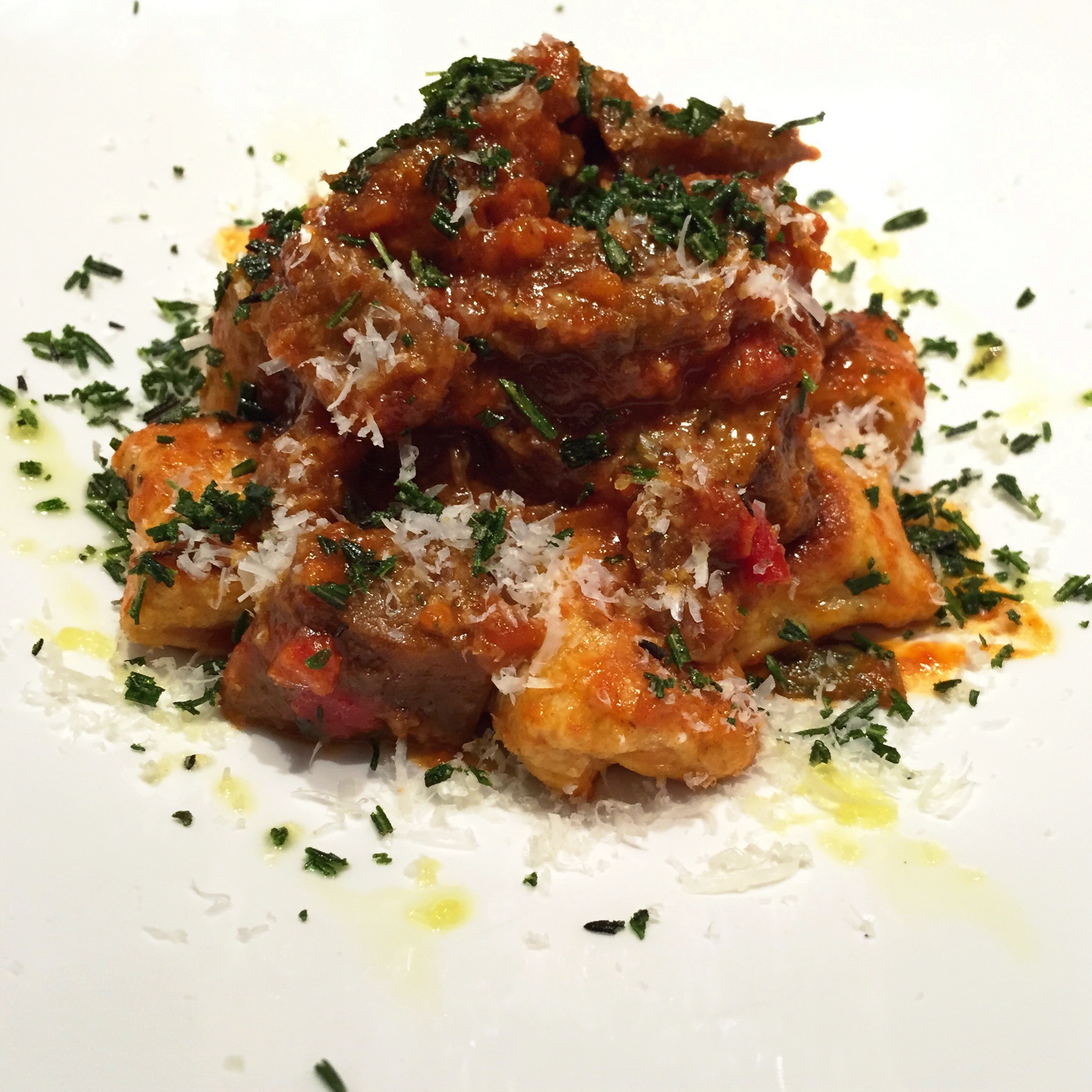 have the recipe memorized. I also learned how to make a caramel sauce, ice cream base, and apple tart from the sweet station. As I demonstrated culinary proficiency to Brian, I was given bigger tasks at the savory stations. I made a few marinades, sauces, and butchered octopus. The biggest task I had was preparing a chickpea tomato stew with honeyed sweet potatoes. At first I didn’t even know where to begin, this was a lot of responsibility. I got myself together and went to go grab and organize all my ingredients. The next thing I did was prep everything, such as peeling sweet potatoes, filling pots with water, chopping onions. As I got my ingredients ready the picture of the dish came more and more into view. Once I had everything prepped out I just jumped in. The sweet potatoes were boiled with a ton of honey and water. While the sweet potatoes were boiling I started on the stew. I toasted spices and sweated onions then I added in a tub of canned tomato and let the