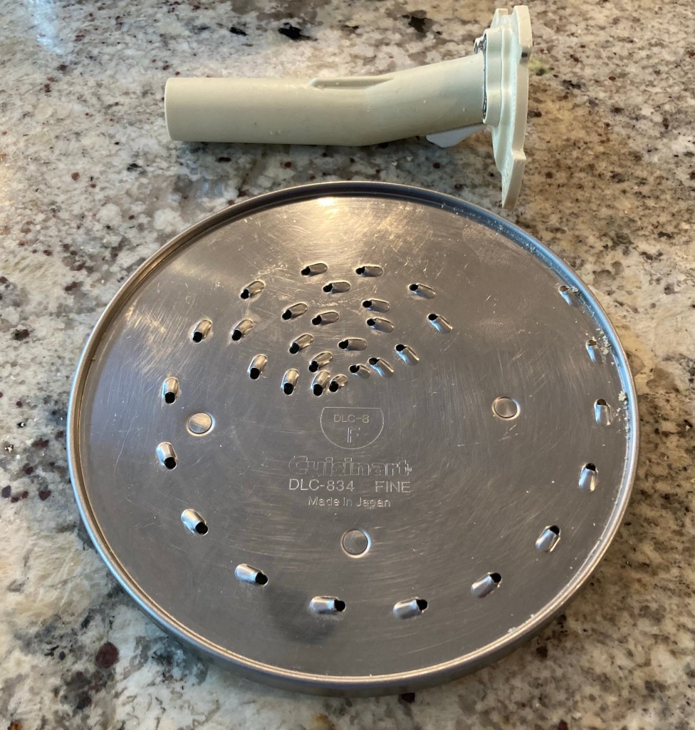 After I sift out the really big chunks from the slotted spoon, I pass them through the the grating disc one more time. Then I change to the slicing blade and chop those nuts so they’re a bit more even.