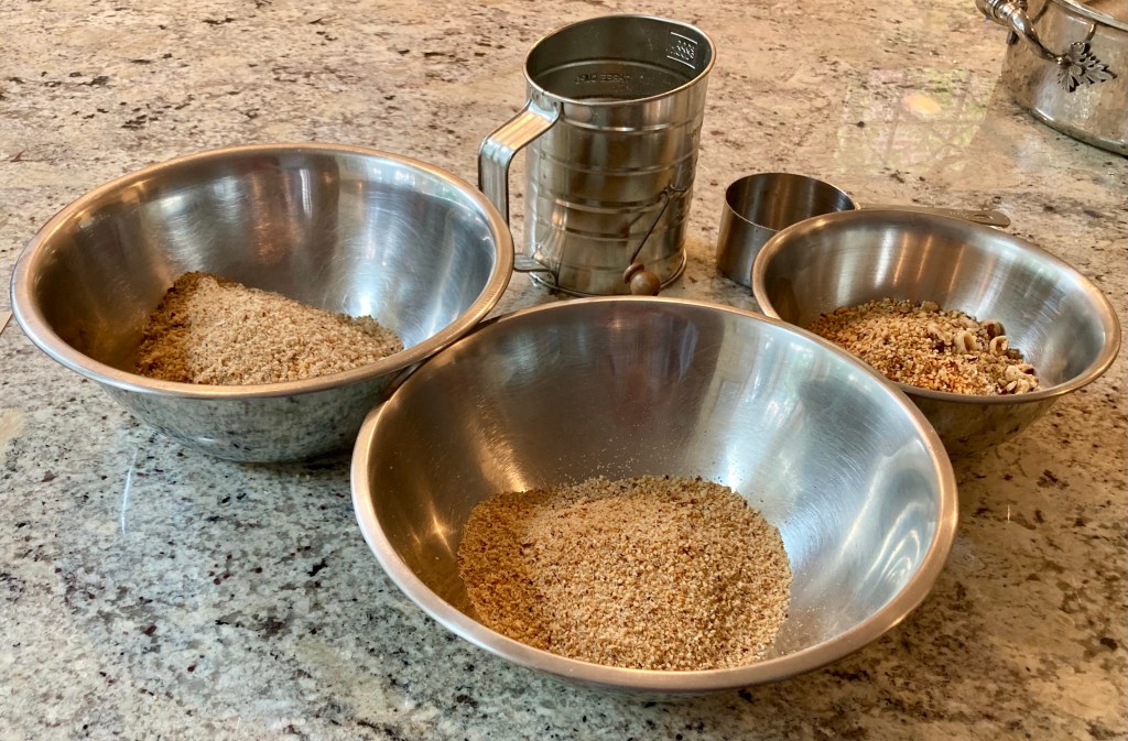 I usually do one pound at a time and store them in my freezer. I use three bowls, a hand sifter and a slotted spoon. I use the first bowl to contain the nuts from the first pass through with the grating disc. You can see in the photo below some fine particles, some large pieces and a range of sizes in between.