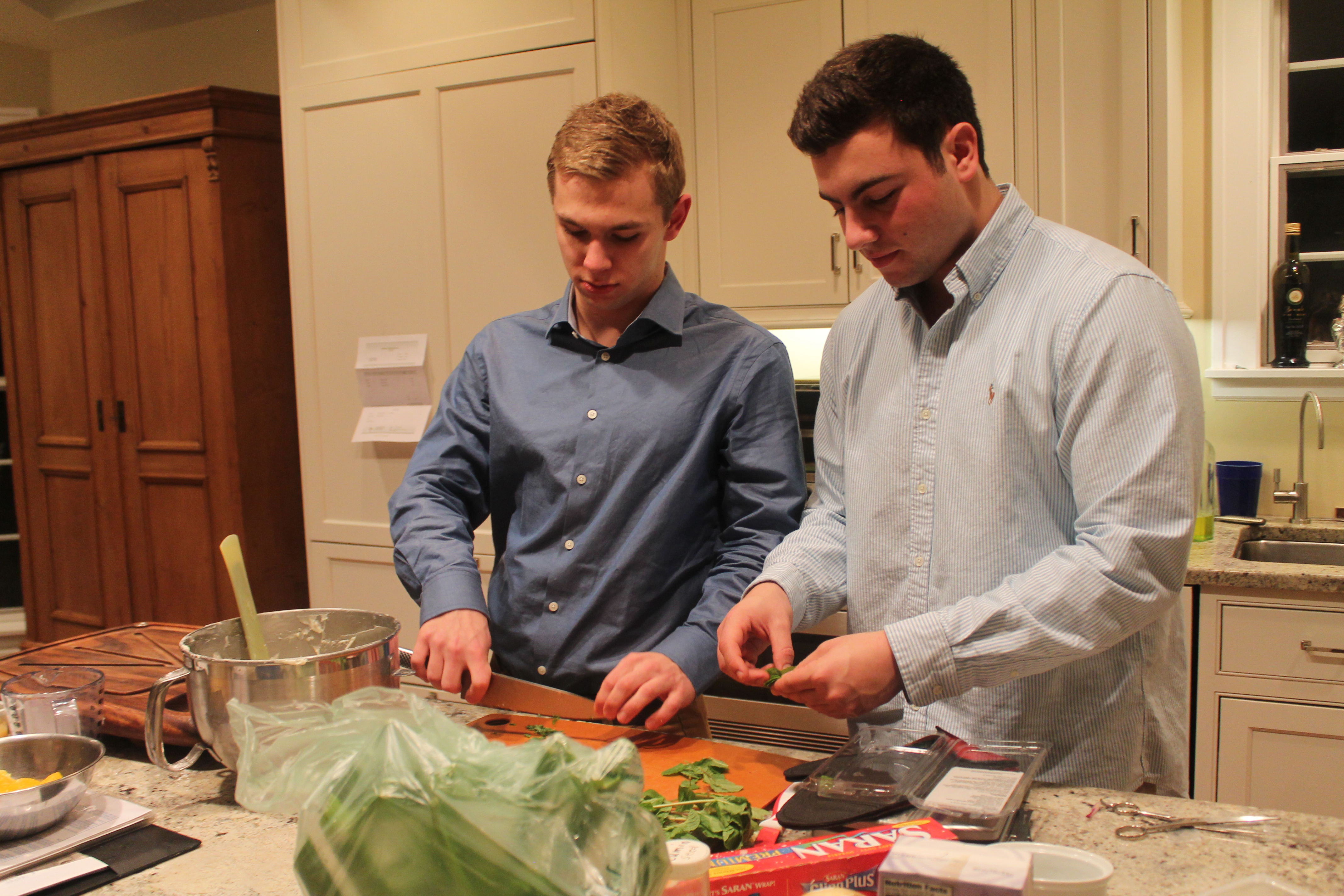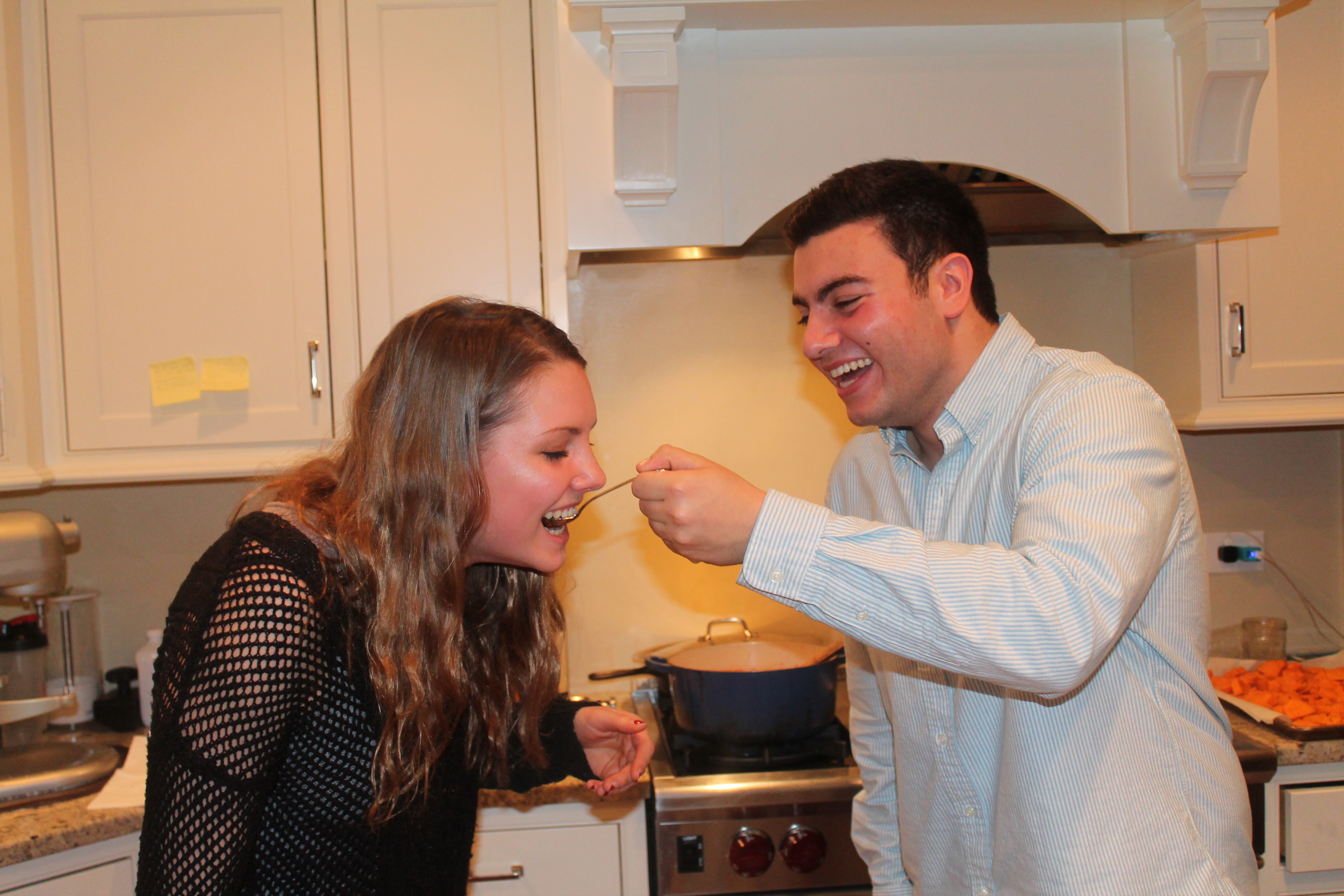 By 5:00, I had my cake done, my focaccia rising for the second time, and my sweet potatoes boiling in a pot with some honey and butter. I was on schedule, but a wall of exhaustion just hit me. Who knew a dinner party would be this much work? Thankfully, a few of the girls offered to come by around 7 and help me out with the final push. Having your guests come early to a dinner party and cooking a little