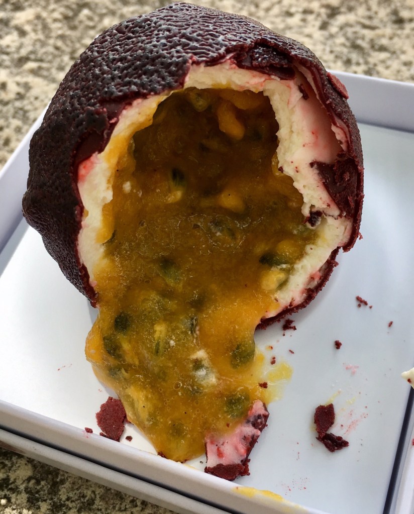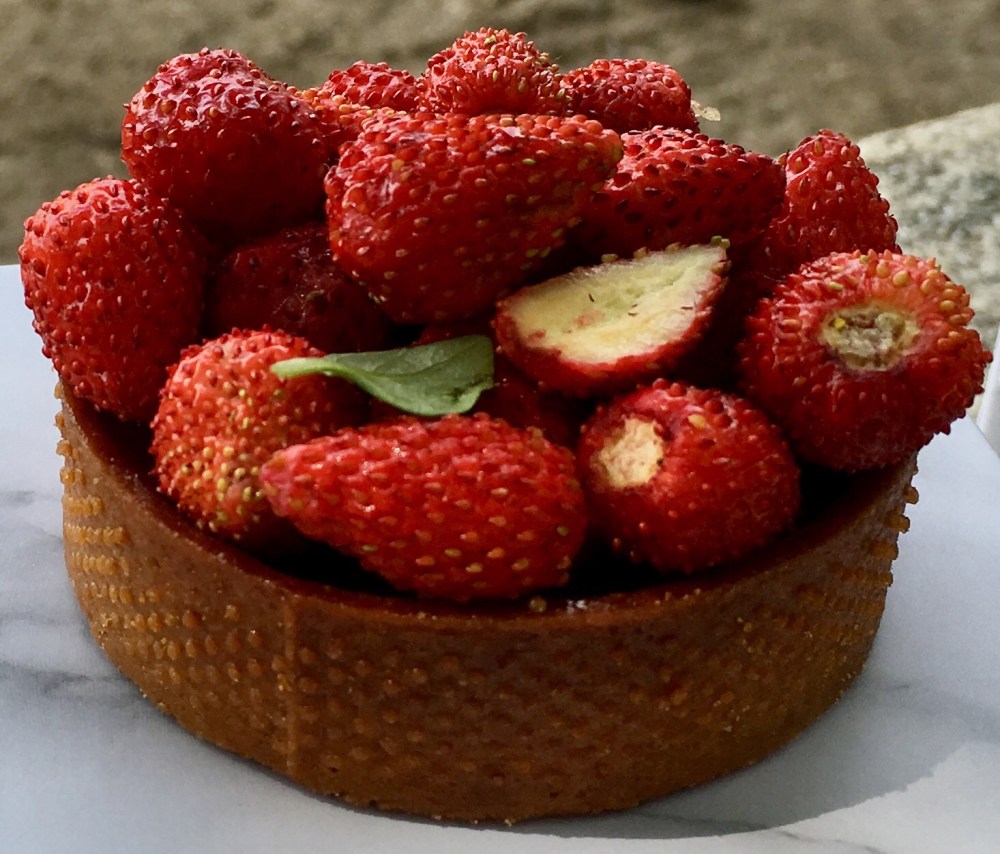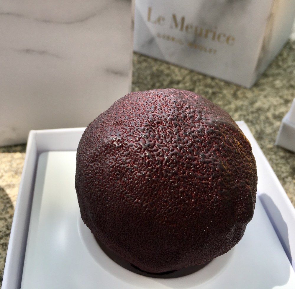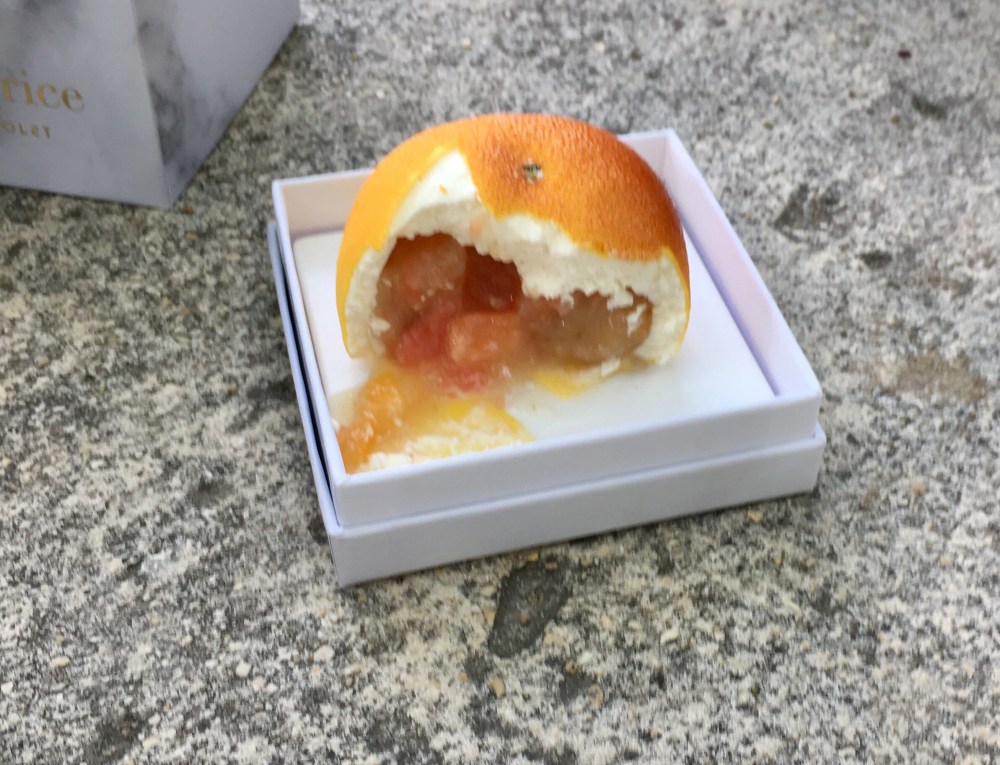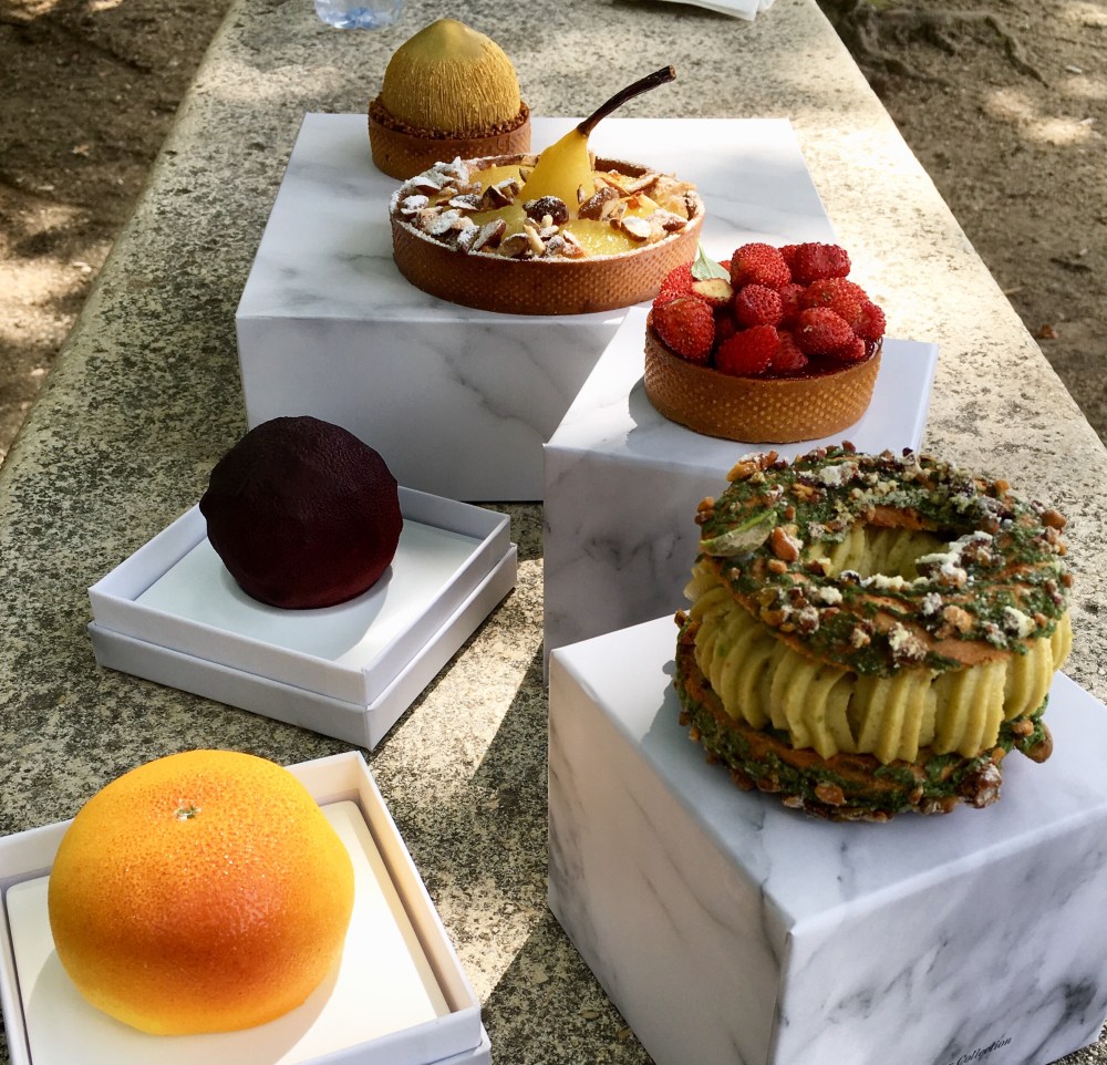 We went to the Tuileries and ate the pastry in the shade. Cedric Grolet is famous for his realistic looking fruits. They are created in special molds. The exterior layer is a thin shell of cocoa butter that has been painted. Underneath that layer is a delicate white cream and inside is a confit of fruit, for example the grapefruit has a grapefruit confit inside, the passion fruit has a passion fruit confit etc. While the craftsmanship is remarkable, my favorite pastries were the tarts. There was a lear tart, a fresh des bois tart with a basil scented pistachio gremolata and a hazelnut tart covered with gold and filled with a creamy layer and a crunchy one. His tart shells are light, crisp and delicate. In the end, we declared Pierre Herme still King of Pastry.