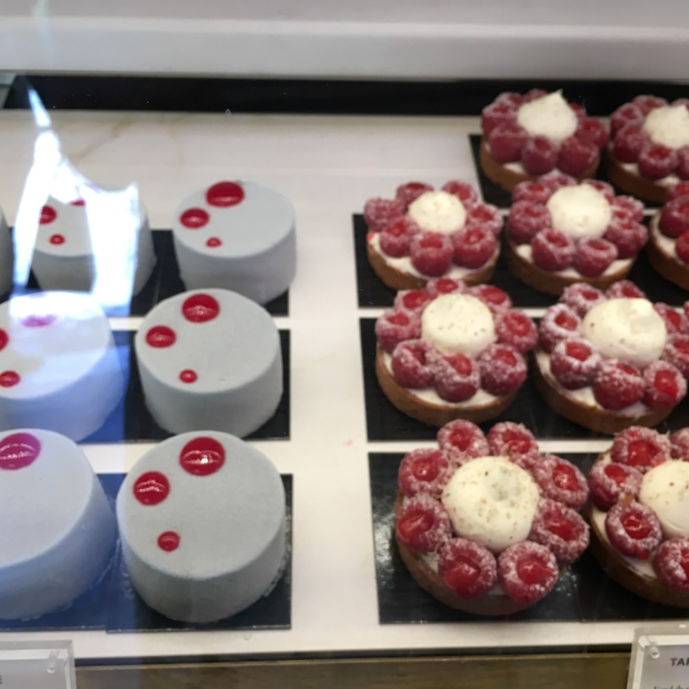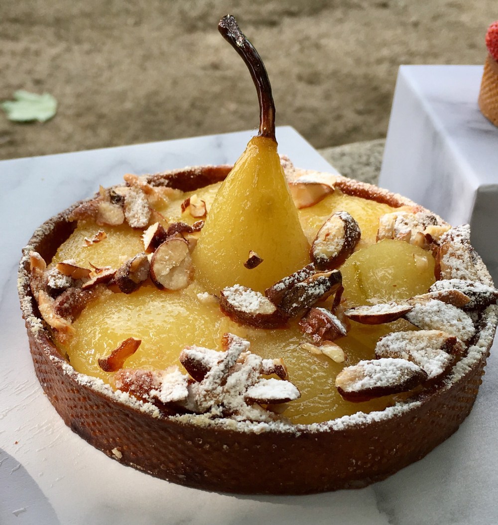 All went according to plan until we were walking through Rue de Rivoli to get the Metro. We noticed people lining up in front of a pastry shop. We stood in line immediately and then googled the chef: Cedric Grolet the only chef in Paris to gain a Michelin star for pastry. We waited 30 minutes for the shop to open, waiting for the bouncer to open the door. Seriously. He was dressed in Le Maurice Hotel employee uniform and he was charming, but he was a bouncer nonetheless. While we waited, I typed on my IPhone that I was a pastry chef from Chicago, beckoned the bouncer and pressed my phone against the glass window. The bouncer came out and gave me a run down on every detail of every pastry. We discussed what we would order. The doors opened and all the chefs came out, shaking hands and saying ” welcome” to all the waiting clients. Finally they opened the door and the first four people gained entrance. After more interminable minutes the door opened again and we were admitted. As I passed by the bouncer he whispered to me, ” Vous prenez la Tarte aux Poires”. I heard someone say ” We’ll take one of everything!” My son looked shocked but pleased and I realized that voice had been mine. We snagged one of the pear tarts, still warm from the oven.