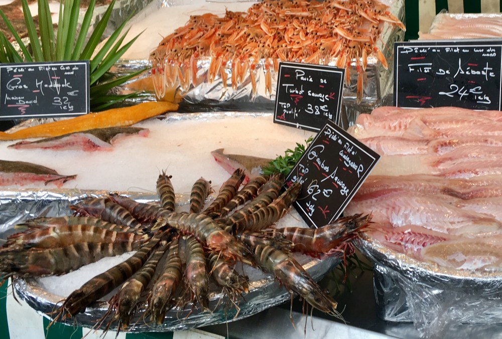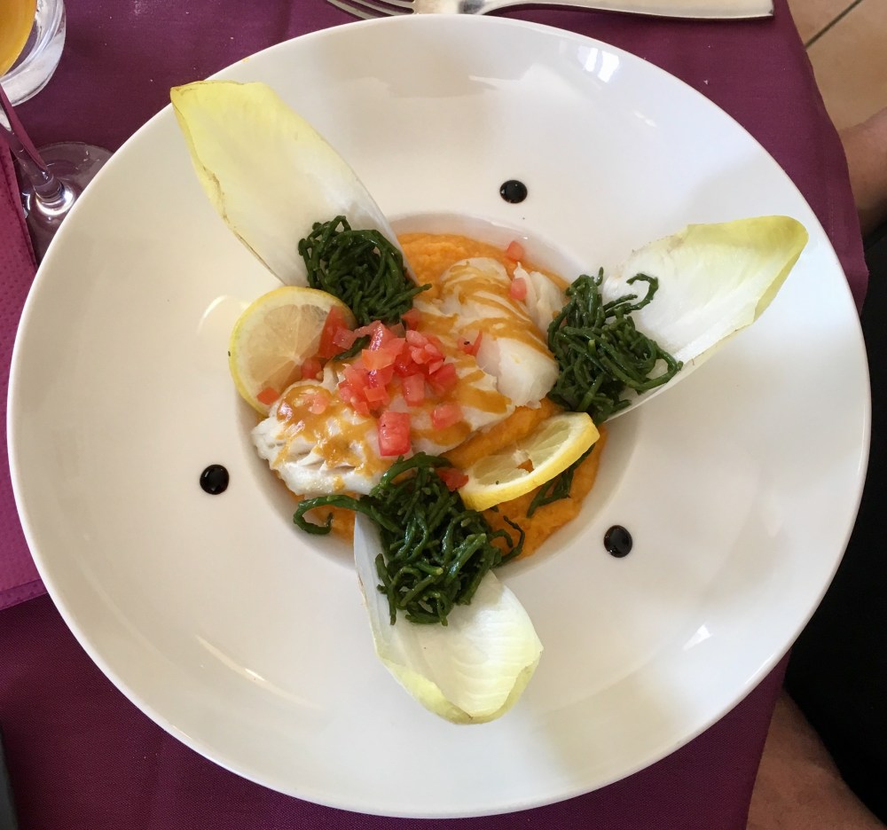 Finally, everyone got ready and we jumped in the van to go to Cancal. It’s a little fishing village that is known for farming oysters. Not as charming as St. Tropez or Honfleur but still nice enough. It’s a steep descent from the town square to the harbor but lots of stuff to look at on the way down including stairs built into the rock face, going up to a private home. The harbor is fairly typical, seafood restaurants and souvenir shops elbowing each other for precious space. Mai treated us to a lovely lunch with friendly waiters who were eager to share their opinions on the best fish and the best way to prepare it. To me, this sharing of recipes and a passion for food is invaluable. So, our waiter’s recipe is for Daurade which is a Mediterranean fish with white firm flesh and a delicate aroma. Allors, take an oven proof dish and make a bed of onions. Put a finger of water, so the onion doesn’t burn and the fish stays moist. Place it in a medium oven and bake until done. You can use fillets but a whole fish is always better.