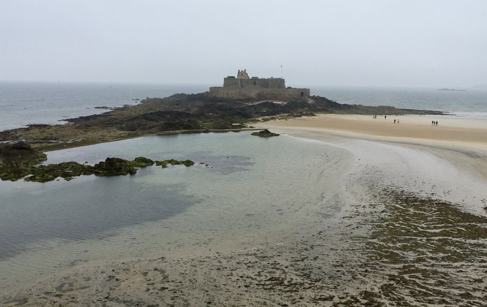Mai is an excellent traveler and so even after rising early, a taxi and then a three hour train ride she was game for exploration. St. Malo was a medieval fortified city that was completely destroyed during World War II and later rebuilt to replicate the old city. We did a tour of St. Malo, walking around the entire town up on the ramparts. The difference in the tides between last night and this morning was remarkable. The water had dissipated to reveal huge rocks that previously had been submerged, a road between St. Malo and a little island with a fortress on top was now visible and a sea water swimming pool, who’s only clue to its existence last night had been a tall diving board, which appeared to float in the water, far from shore. Today one could see the edges of the pool and the diving board at its edge. Daniel wondered what sea creatures could be lurking in the pool. My prior phobia about being attacked by a shark in a fresh water swimming pool emerged momentarily and sent a chill up to my scalp and down my spine. Yep, not going in that pool.