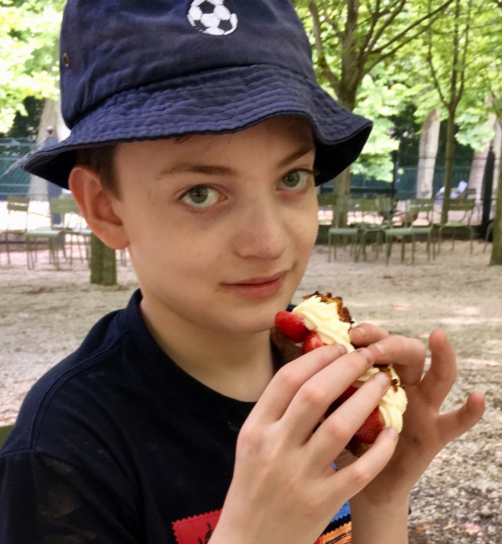 After fishing we took a commuter boat to St. Germaine for our pilgrimage to Les Deux Magots where we ate the usual Jambon pain Poulane and Pierre Hermes 2000 Feuille. We worship at the altar of Pierre Hermes, still one of the best pastry chefs in Paris. The 2000 Feuille pastry is composed of delicate layers of caramelized puff pastry that shatter under your bite, layered with silky hazelnut cream and one crunchy layer at the bottom of hazelnut cream mixed with crepe dentelle and a bit of chocolate. It is the crunchy, creamy confection that I’m always on the hunt for and all incredibly light and full of flavor. We had a charming waiter, which was lucky because Les Deux Magots is old school and has many grumpy waiters. We spilled a glass of water and a cup of coffee in the process of containing Michael and the waiter appeared immediately with good humor and aplomb to wisk away the evidence. We suggested that Michael stay and wash dishes for the rest of the day but our offer was politely but hastily declined.