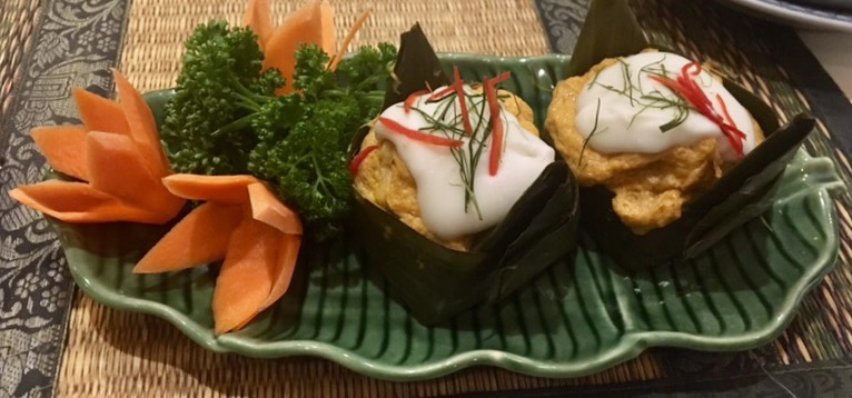We went back to the hotel with our treasures and rested before dinner. For dinner Mai took us to a very good Thai restaurant. The last time we were there Tonton Laurent had ordered a cod cooked in a banana leaf with coconut milk, lemongrass and a bit of red curry. I had been dreaming about it for 3 years and so I ordered that. It was worth the wait.