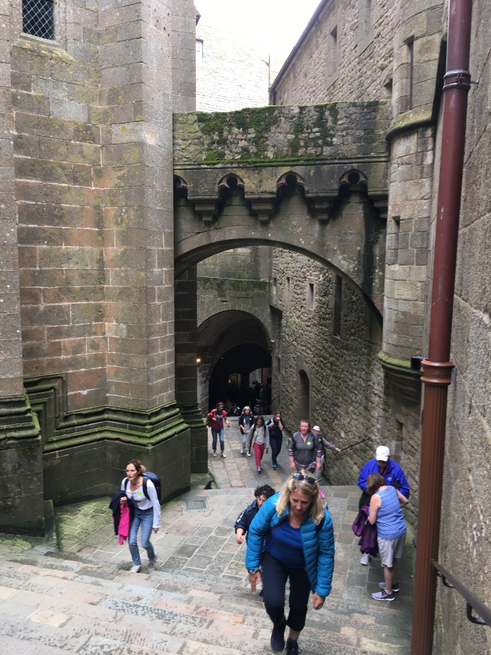 Today we went to amont Mont Saint Michelle. My memory of this little fortified city proved better than the reality. You can’t go home again. If somehow, you can go one evening off season, close to the Equinox where the tides are at their strongest and most dramatic, it would be worth it. It is a beautiful natural site, a little town built on a tiny island island that is surrounded by water at high tide and wet sand at low tide. I long to watch the tide come in “ like a galloping horse” as is the legend. The church on top of the island is lovely and we were lucky to reach it just as it choir began singing. It was a magical moment and made one forget the oppressive crowds and tchotchke shops that lined the streets below.