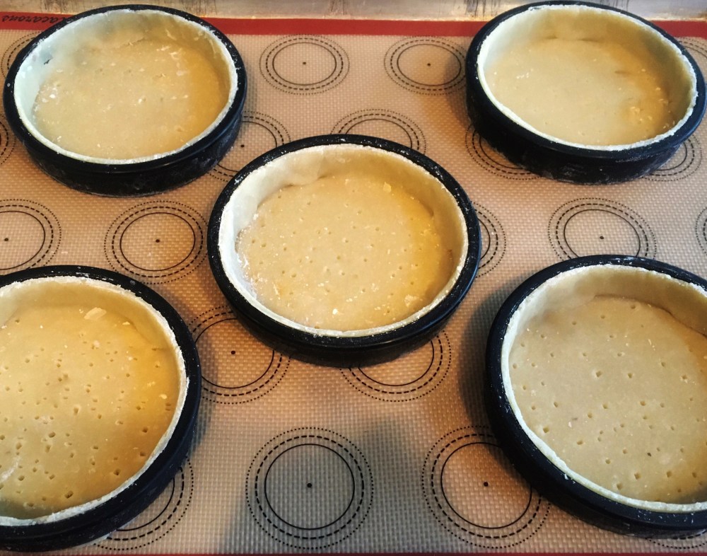this dough should rest at least an hour and preferably 4. When ready to use, let it soften a bit outside the fridge and roll it between sheets of plastic wrap to 1/8″ (3mm) for 8″ or 9″ tarts and 1/16″ ( 2mm) for 3″ or 4″ tarts. If you’re using a professional sheeter, sandwich the dough between pieces of parchment paper.